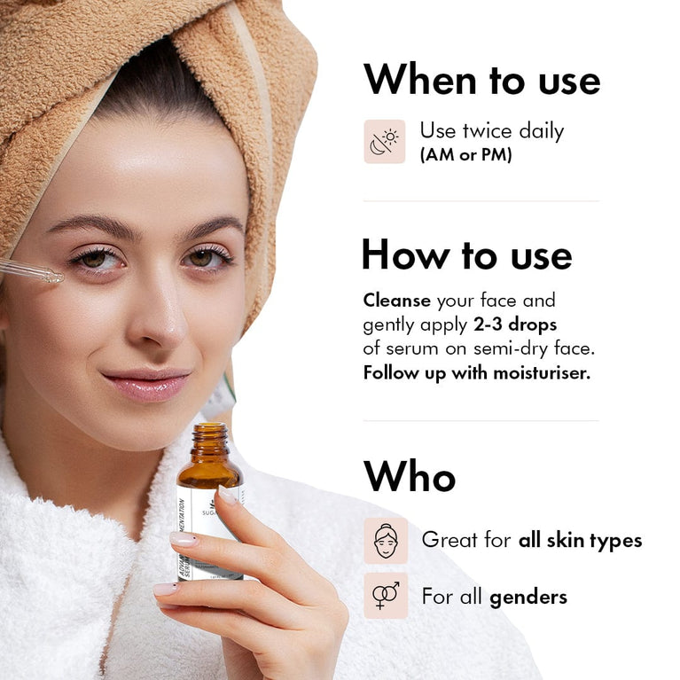 Use it in the AM/ PM routine, after using a toner. Follow it up with a moisturiser and sunscreen (during the day). Begin using 3 times a week, gradually increasing the frequency week on week.