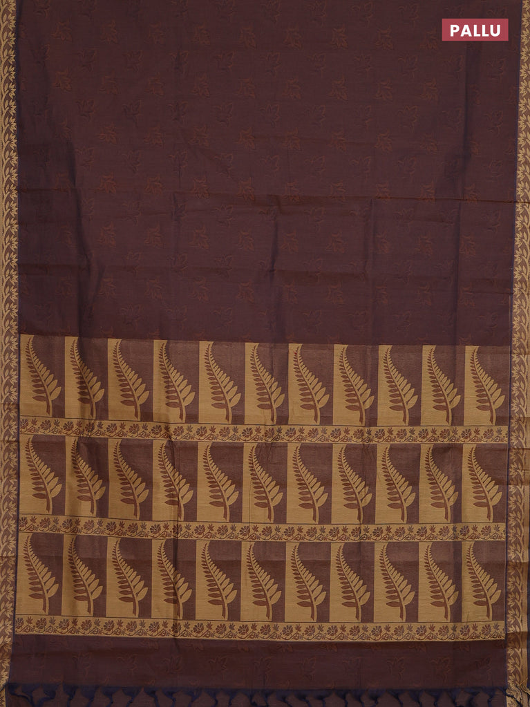 Coimbatore cotton saree deep jamun shade and sandal with allover self emboss and thread woven border