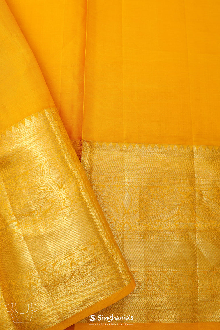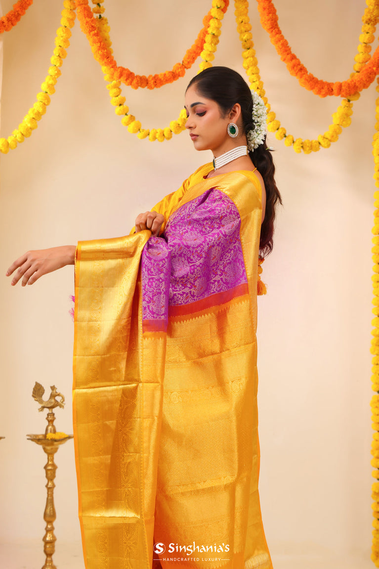 An ornate fusion of cultures - this Dark Magenta Kanjivaram Silk Saree features eclectic gold & tilfi zari woven floral and bird motifs all over. The contrasting yellow big border with floral-paisley and birds pattern, complementing the elegance.