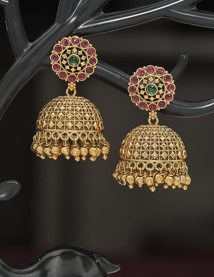 These Designer Matt Kempu Jhumka Earrings feature a matt finish with beautiful ruby and emerald stones. They add a colorful and elegant touch to any outfit, perfect for special occasions or everyday wear.