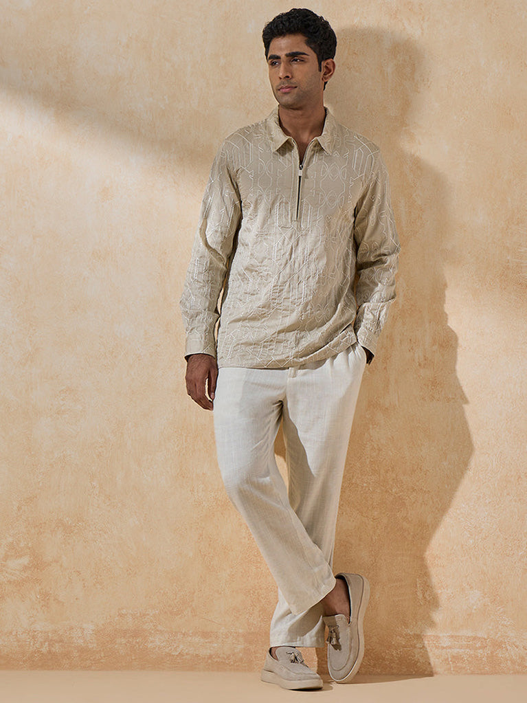 A festive standout with a contemporary edge, this beige shirt is defined by abstract geometric embroidery that adds artisanal character to its clean silhouette. Modern accents like a half-zip placket, zip pocket, and buttoned cuffs bring a refined yet functional touch, setting it apart from traditional festive wear.