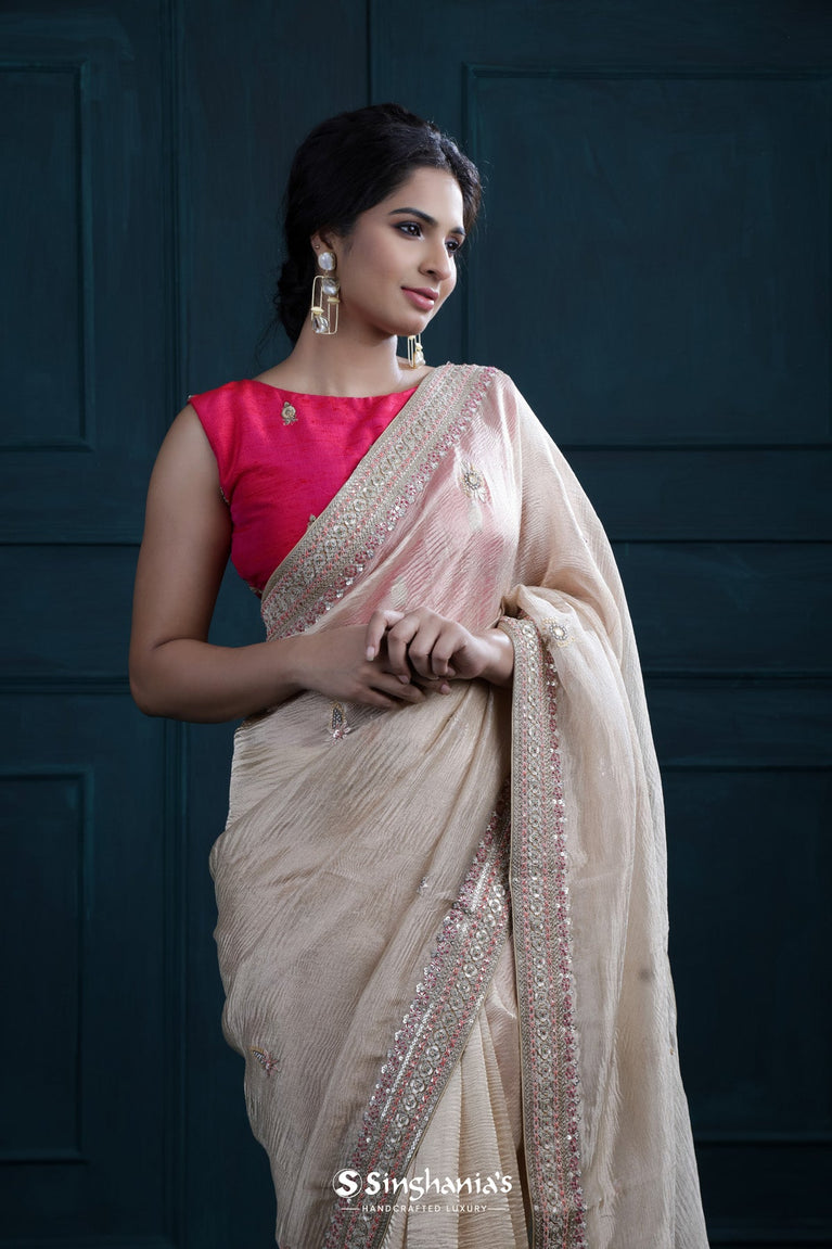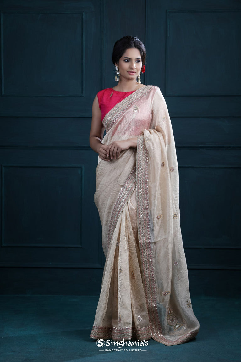 Almond Beige Tissue Organza Saree With Chikankari Embroidery