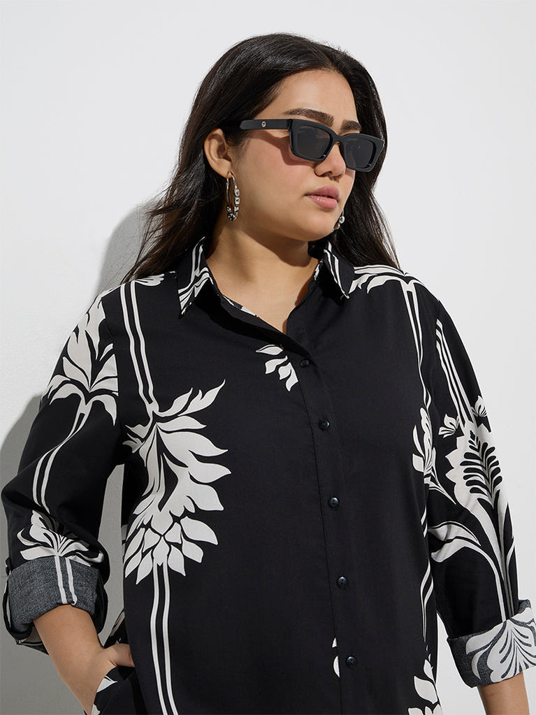 This black shirt from Gia blends breathable comfort with elevated detailing. Floral embroidery lends a timeless yet modern charm, while the soft fabric drapes gracefully without clinging. Designed with a collar and button placket for structured polish, and three-quarter sleeves for added coverage, it is a versatile piece that flatters curves effortlessly.