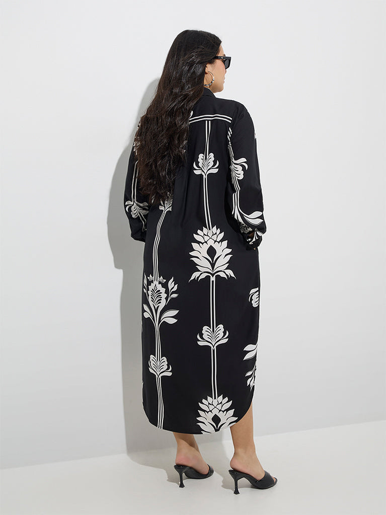 This black shirtdress from Gia is adorned with intricate floral prints that offer a bold yet graceful contrast. Created from quality fabric for a flattering drape, it’s styled with a smart collar, a button-down front, and full sleeves for a polished finish. Thoughtfully designed with side pockets, this dress blends functionality with timeless charm.