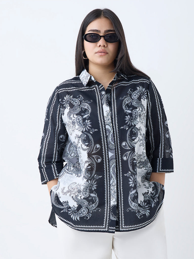 Effortless charm meets timeless detail in this black shirt from Gia, adorned with delicate paisley motifs. Spun from pure cotton for elevated comfort, it features a classic collar that flows into a button placket, while three-quarter sleeves lend a polished finish.