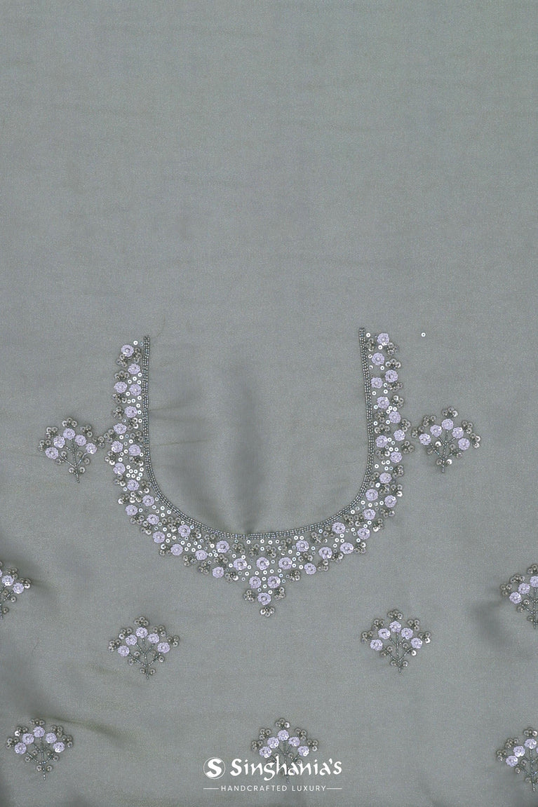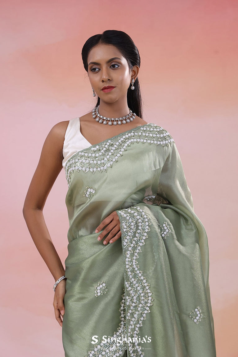 This buttis embroidered with dyeable sequins and beads work on the Antique jade organza tissue saree complemented with wave like embroidered pattern.