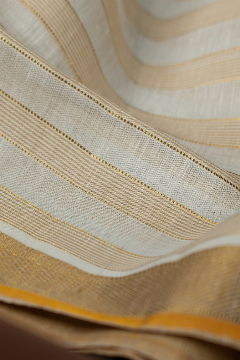 Crafted with love, this Kancheepuram Silk Stripes Off White Dhoti is a timeless piece. Adorned with resplendent stripes gracefully adorning its body, this masterpiece weaves a tale of tradition and magnificence. Each intricate pattern, meticulously crafted, mirrors the brilliance of a thousand stars. The ethereal off-white hue casts a spell of purity and grace. Enhanced by the majestic Diamonds Contrast Border, this dhoti embodies the essence of grandeur and opulence.