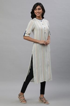 Revamp your fashion game with yarn dyed straight kurta. It showcases a trendy V-neck with eye-catching piping detail, a shoulder yoke with slight gathers for a contemporary twist on classic stripes. The addition of cuff details with solid tabs infuses elegance into this casual piece. For a smart and stylish casual ensemble, effortlessly combine it with our denim lycra jeggings.