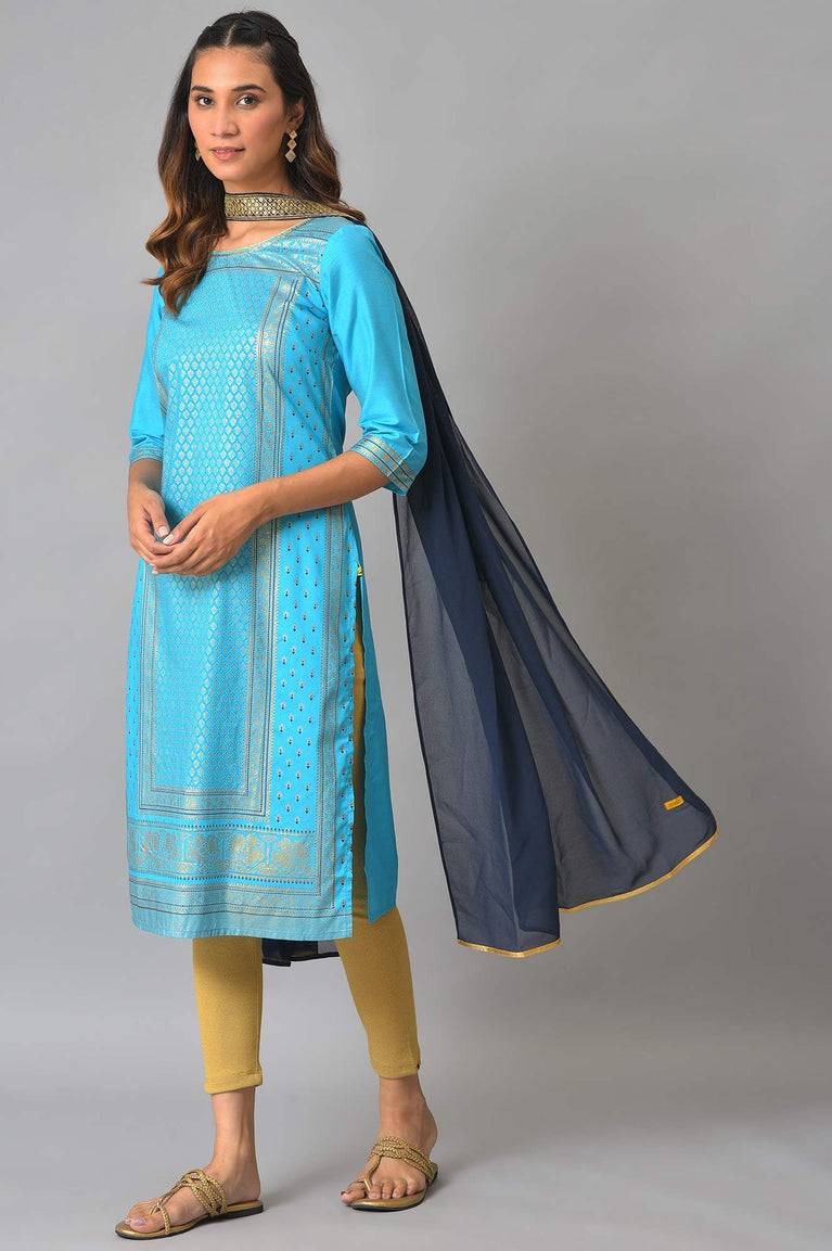 Blue Foil Printed Embellished Kurta, Pants and Dupatta Set