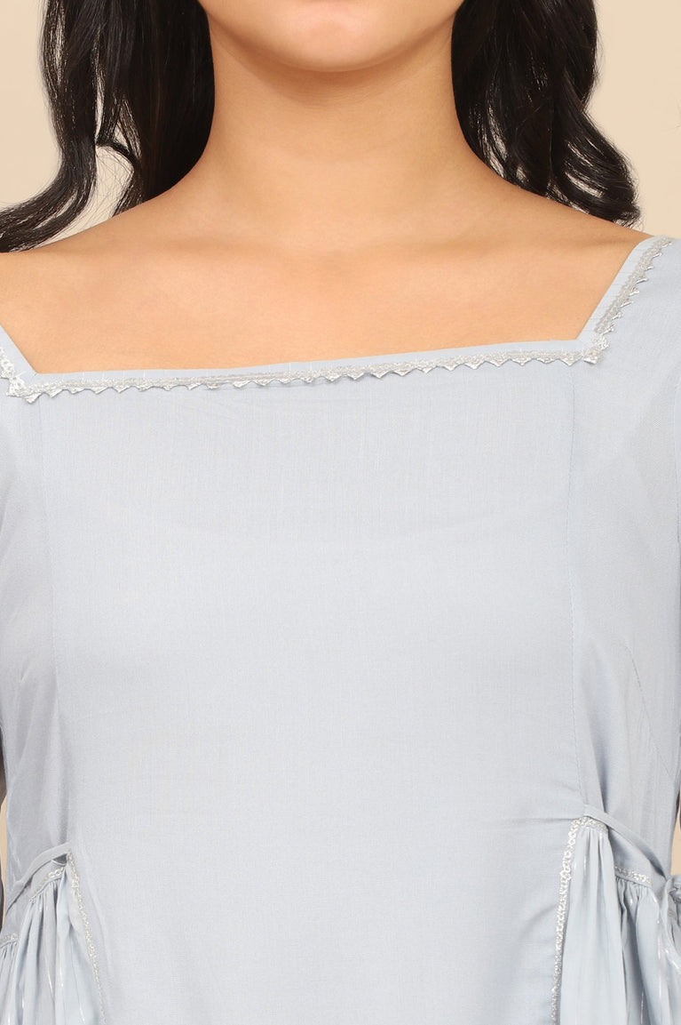 This blue round neck 3/4 sleeve kurta has flared hem.