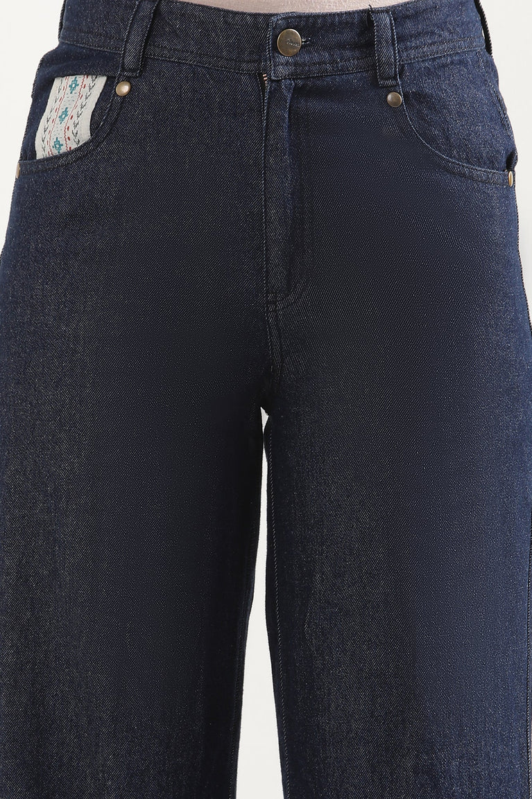 Blue Solid Flared Denim Palazzo With Printed Side Inserts