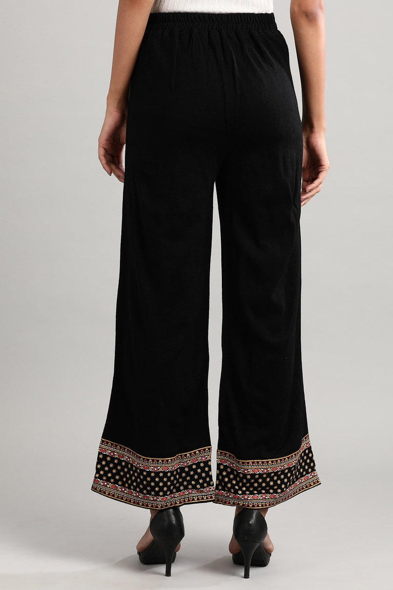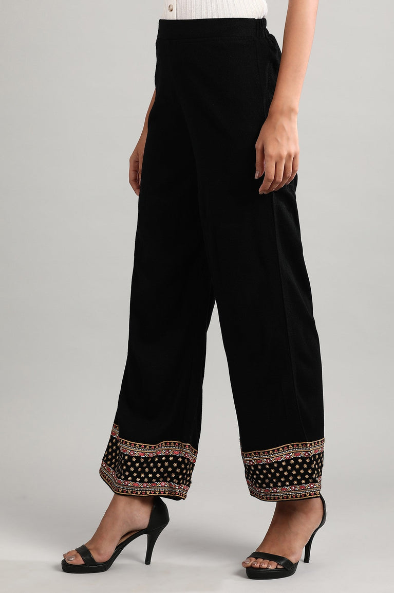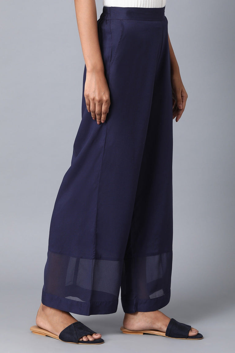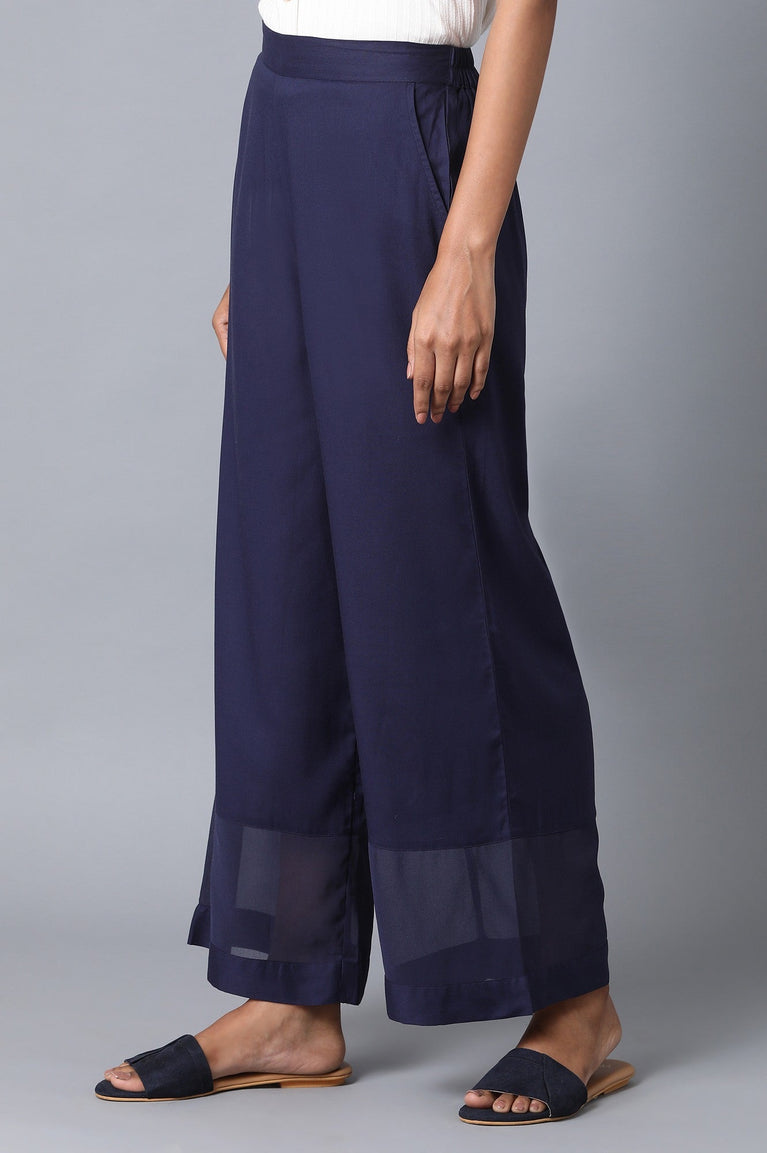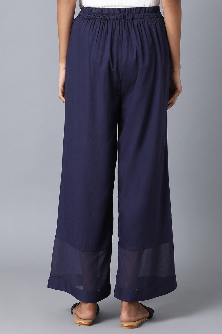 Blue solid straight palazzo pants in mid-rise and partially elasticated waistband. The palazzo pants features two front pockets and georgette insert at hem.