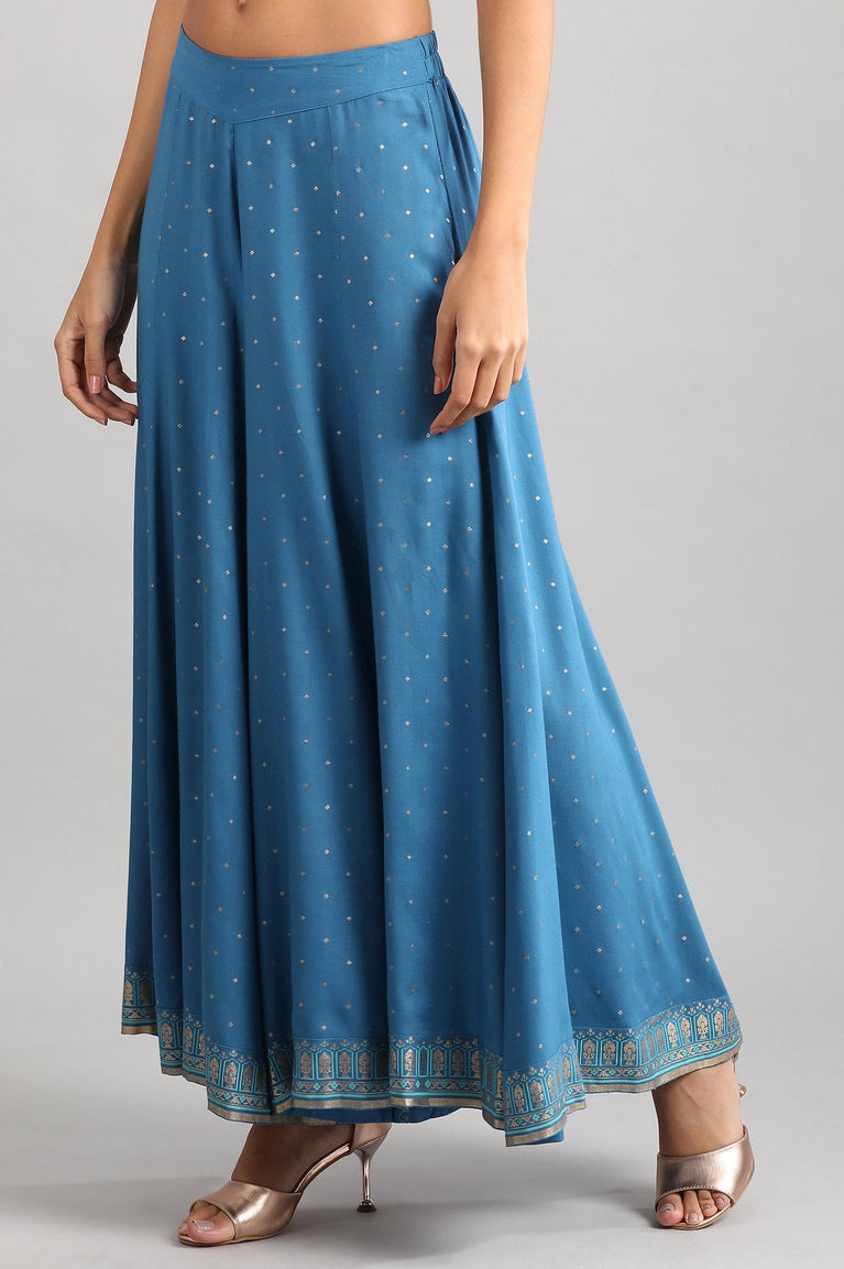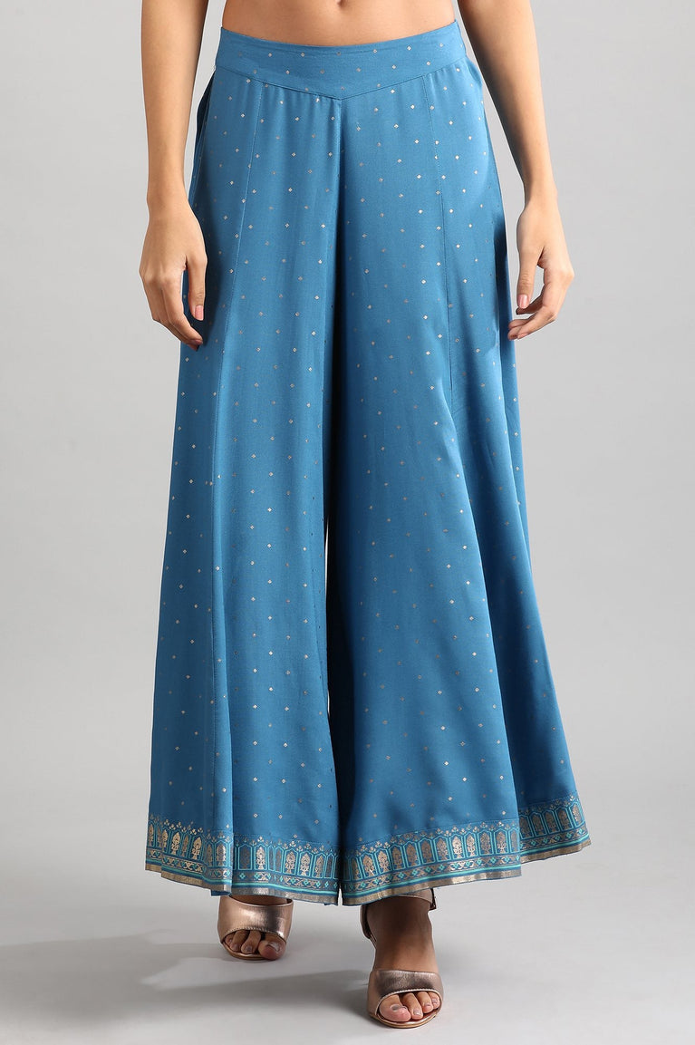 Blue coloured straight fit cotton palazzos with floral foil print detail and an elasticated waistband.