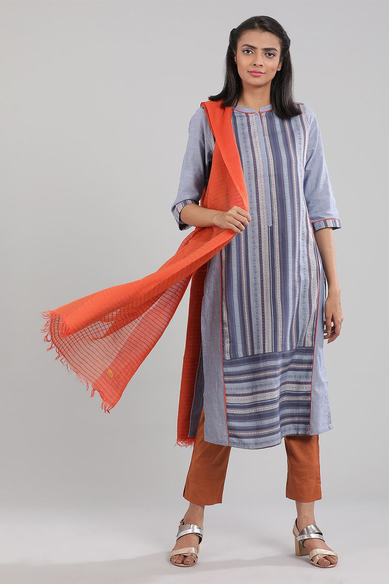 This blue round neck 3/4 sleeve ankle-length kurta has printed detail, flared hem and border detail around neck and hem.