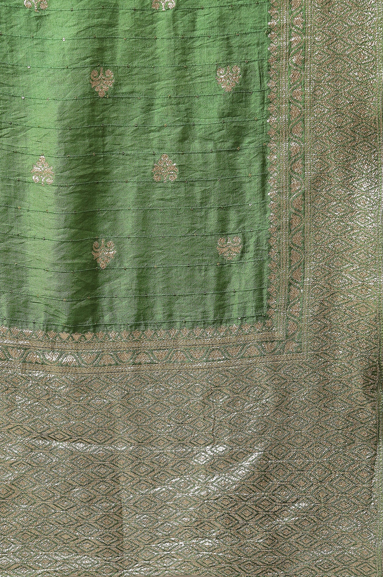 Get ready for the light festive look with this pretty foil printed kurta set. The kurta has embellished round neckline and printed border on sleeves' hem. It is paired with contrasting green printed palazzos and dupatta.