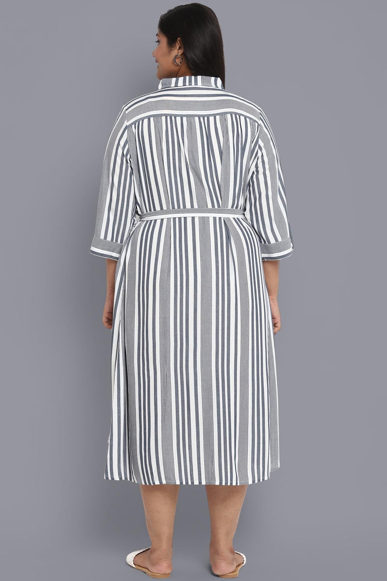 Blue coloured straight dress having shirt collar with buttoned placket and three-quarter sleeves.