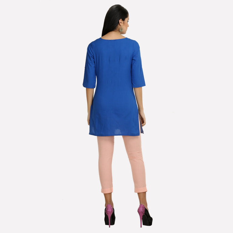 Blue round neck three-fourth sleeve kurta with printed detail, flared hem and border detail.