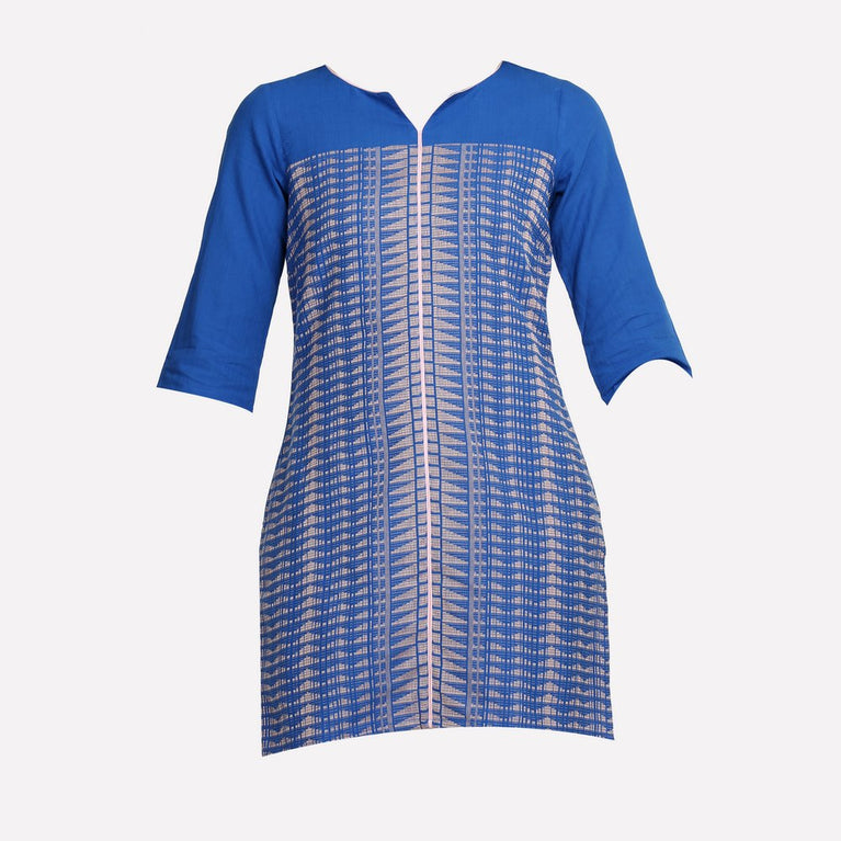 A trendy piece of festive kurta, combined with rich textured rayon complimented with chunky chevron embroidery to make you stand above the crowd. It has a round neckline, with contrast piping, and elasticized piping for a feminine look.