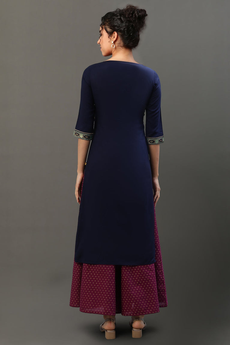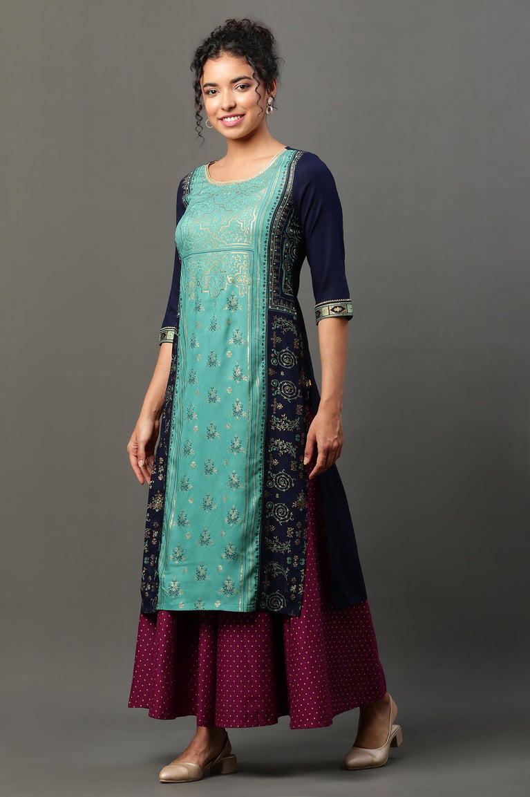 This blue round neck 3/4 sleeve ankle-length kurta has printed detail, flared hem and border detail around neck and hem.