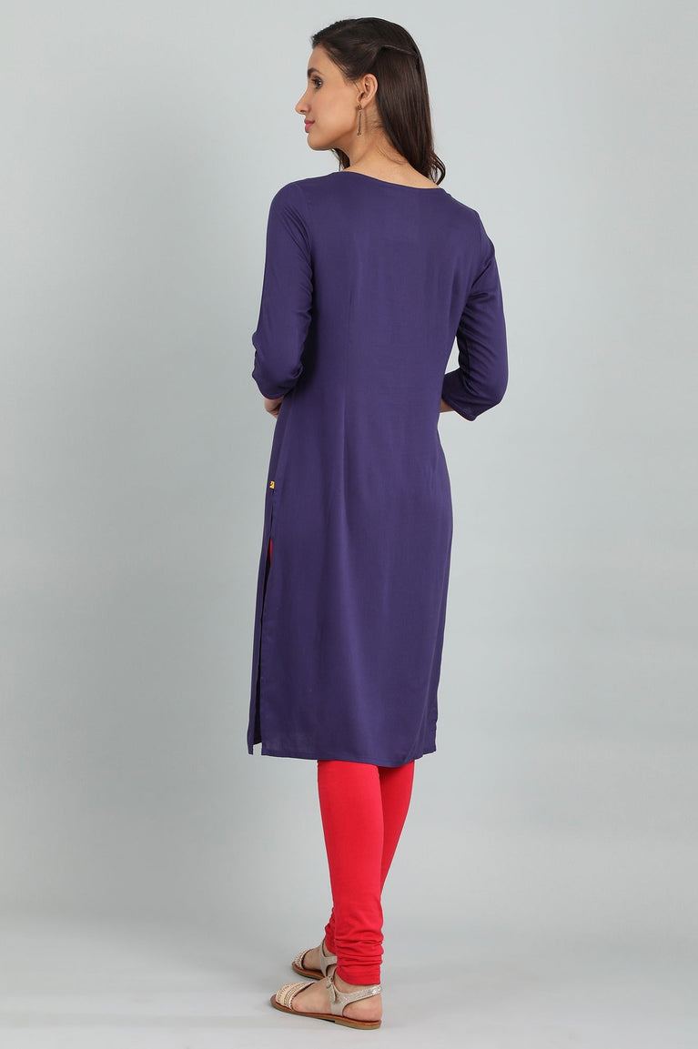 This blue round neck 3/4 sleeve kurta has printed detail and side slits.