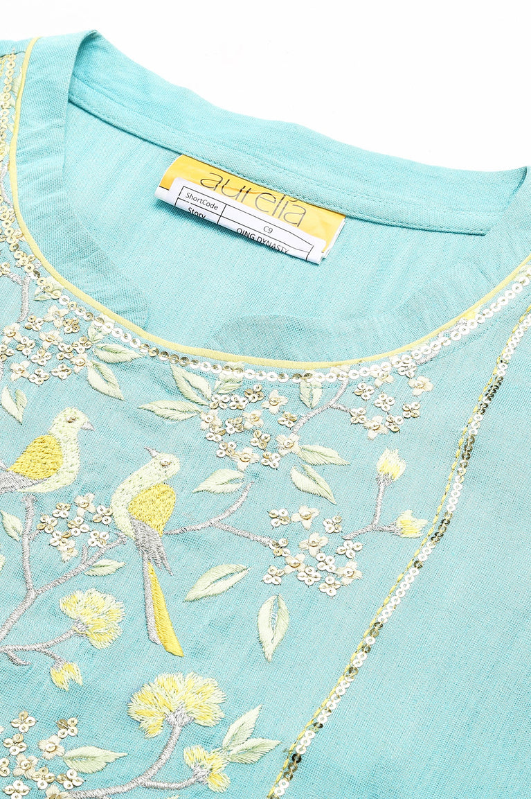 Blue round neck 3/4 sleeve kurta with embellished yoke detail.