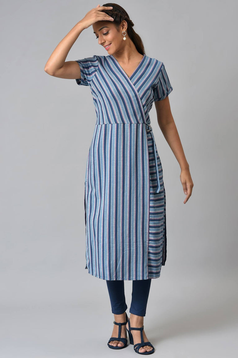Blue Stripe Print Cotton kurta with Side Buckle