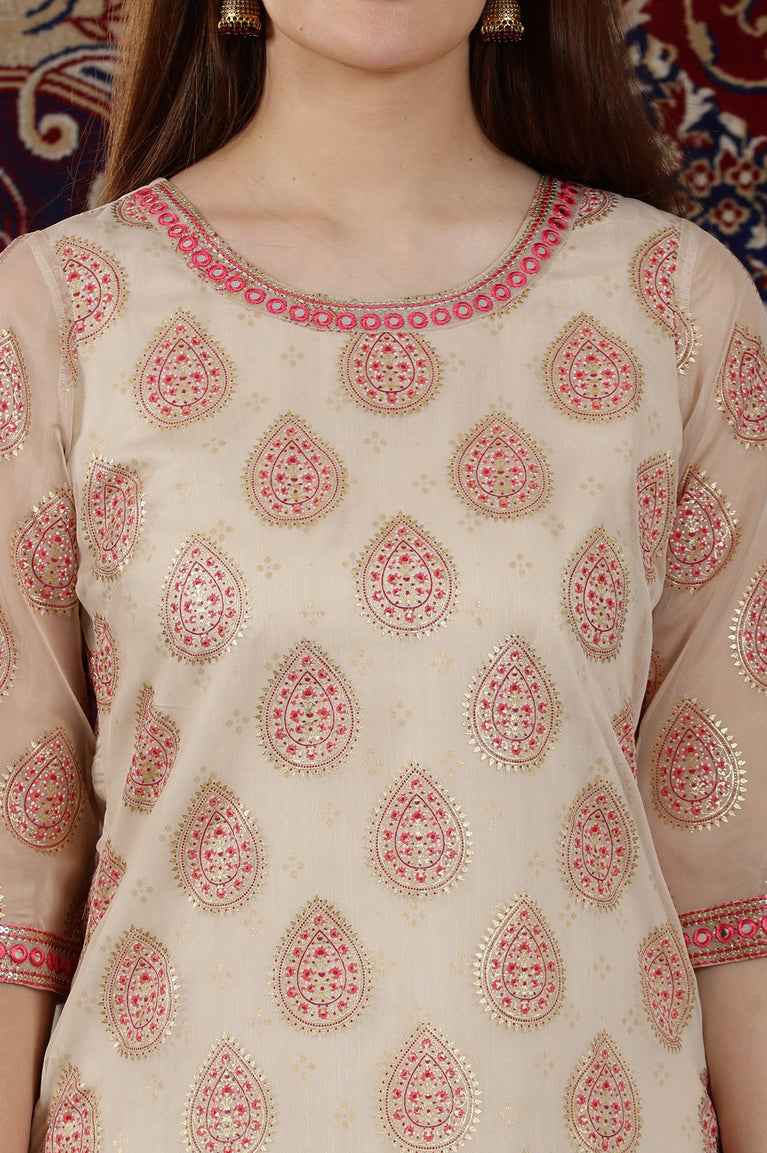 Cream Abstract Printed Organza Sheer Straight Kurta with Mirror Embroidered Neck