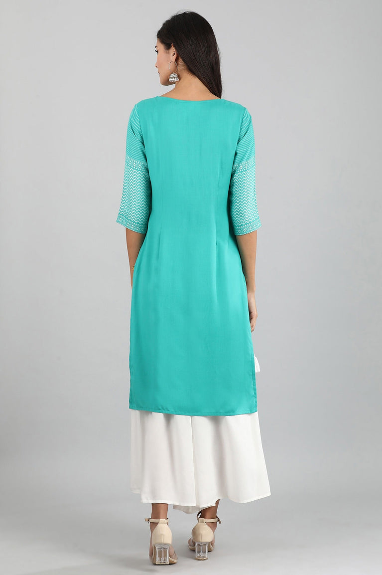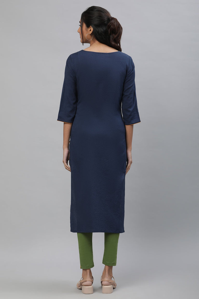 This blue boat neck 3/4 sleeve kurta has side slits.