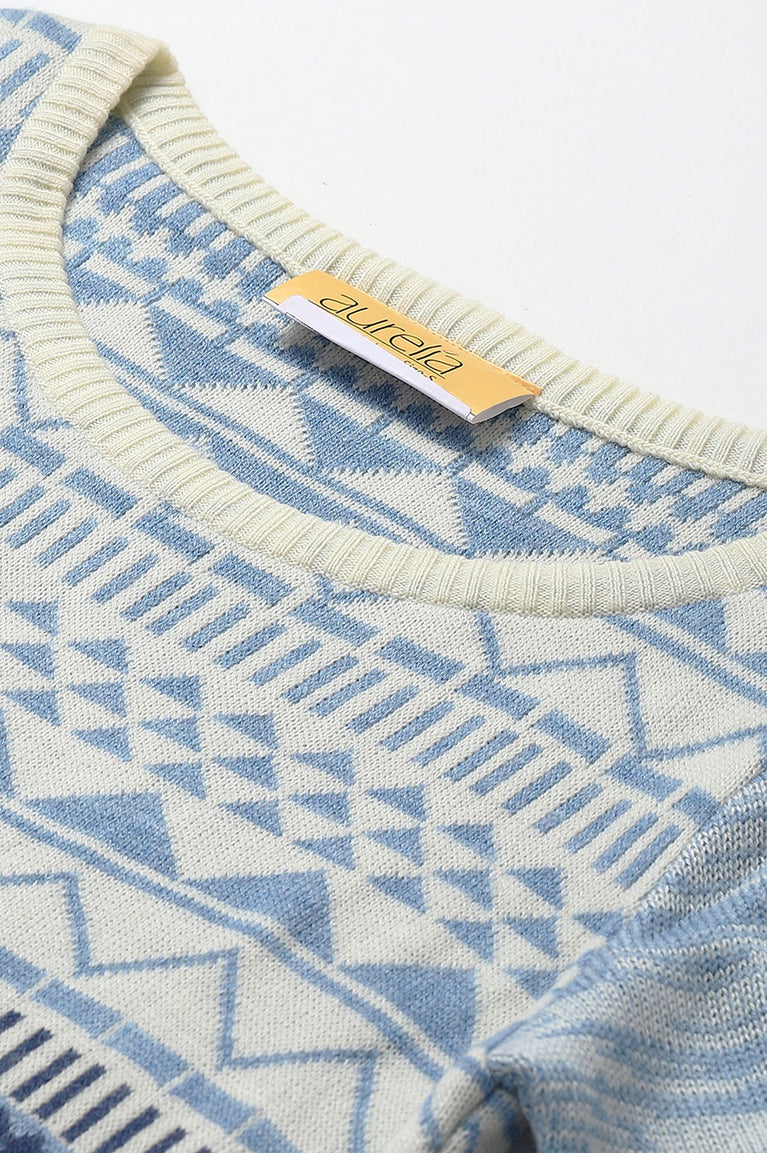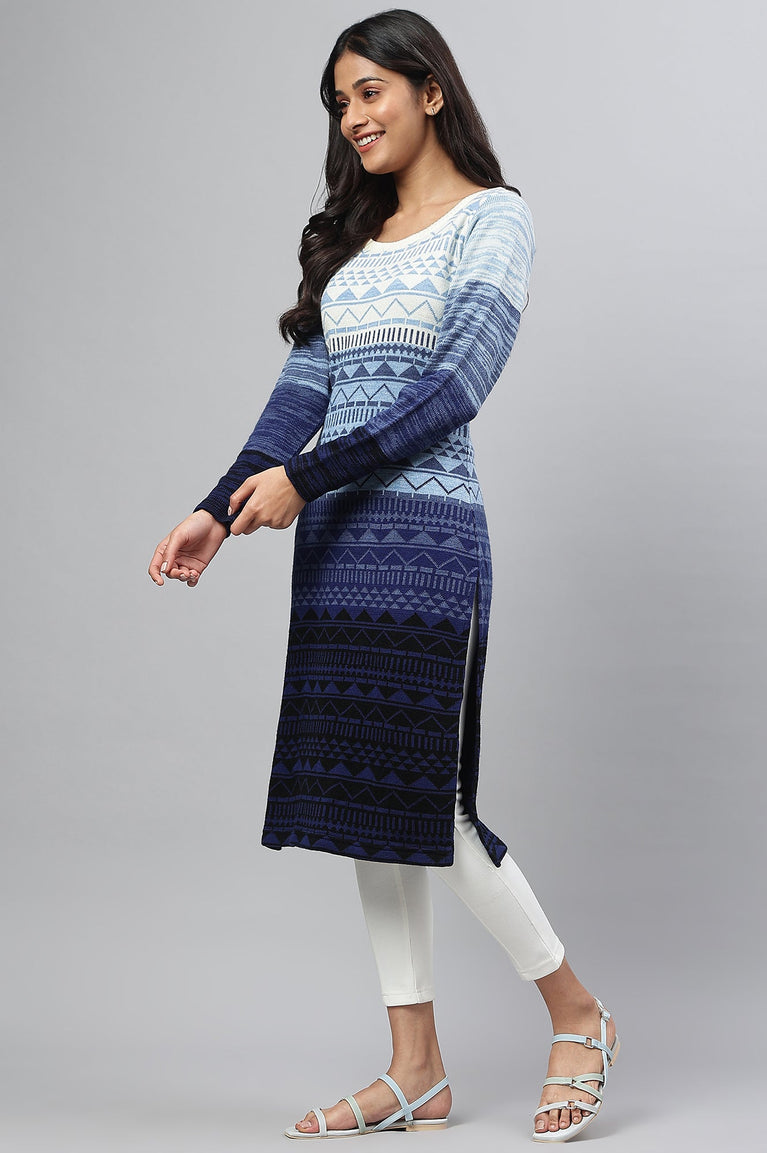 Blue Warm Jacquard Winter Kurta and Tights Set