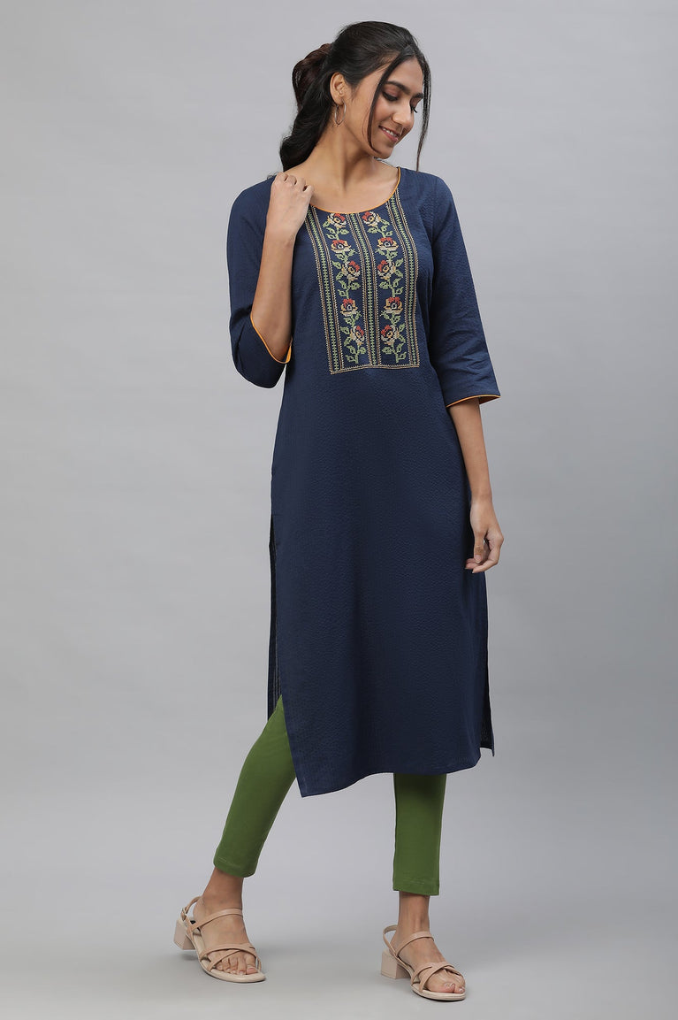 Blue round neck straight yarn-dyed Liva kurta with geometric pattern detail.