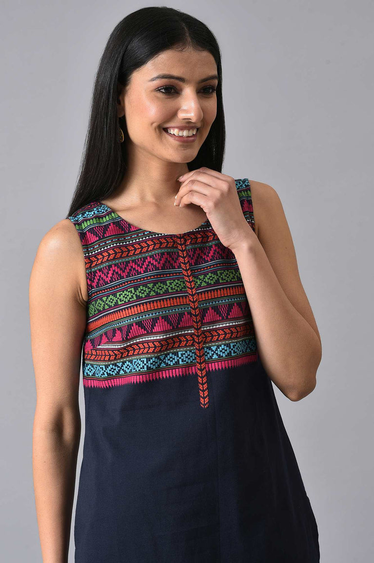 Blue round neck sleeveless kurta with tie-up detail at the neckline.