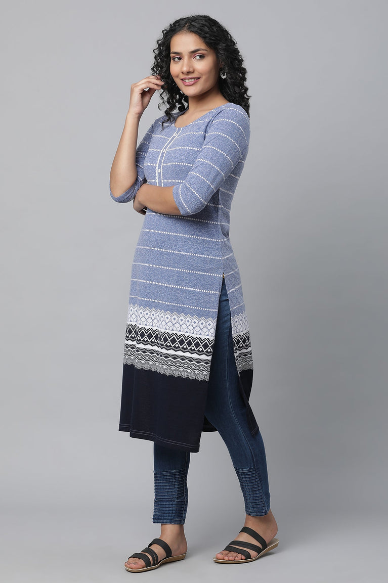 Blue Jacquard Knitted kurta & Denim Jeggings Set