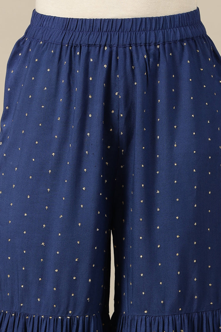 Twilight blue kurta having glittered floral print and sequin detailing. This straight silhouette kurta also features V-neck and short sleeves. It comes with solid blue palazzo in mid-rise and elasticated waistband.