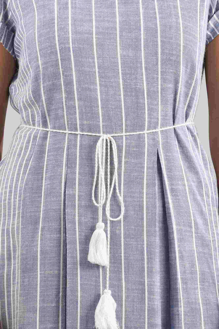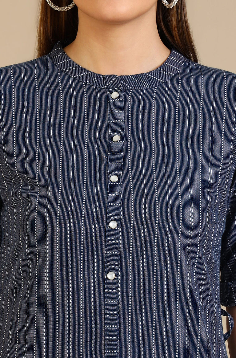 Step out in style with this chic A-line dress in a classic blue hue, enhanced with white stitch lines for a touch of elegance. Designed with a Mandarin collar, buttoned placket, and 3/4th roll-up sleeves with a tab detail, it offers a blend of sophistication and functionality. Crafted from premium yarn-dyed fabric, this dress ensures comfort and a polished look for both casual and semi-formal occasions.