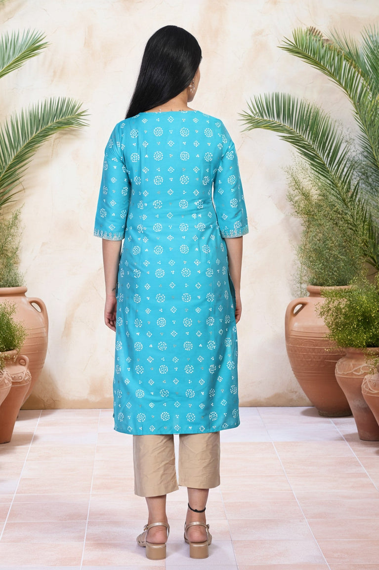 A vibrant expression of festive grace, this stunning kurta for women is a masterpiece of traditional design and modern comfort. Crafted in a breathtaking Azure Sky hue, it’s a piece designed to make you shine at any celebration. It's the kind of apparel you'll feel instantly radiant in. The silhouette is a timeless straight cut that flows effortlessly, offering both elegance and ease of movement right down to its classic straight hemline. This ethnic tunic features a flattering V-neckline, which is highlighted with delicate, shimmering ornamentation that serves as the yoke's focal point, beautifully framing the décolletage. Adding to its charm are the three-quarter sleeves, which provide graceful coverage and end in finely detailed cuffs that echo the intricate design at the neck. Subtle tape detailing runs vertically along the seams, a thoughtful touch that adds a structured yet decorative element to this beautiful garment. The all-over traditional print is inspired by classic motifs, rendered in a crisp pattern that feels both authentic and wonderfully fresh. This printed straight kurta is fully opaque for complete confidence and features comfortable side slits for ease of movement. It's a single, standout piece that forms the perfect foundation for your festive look.