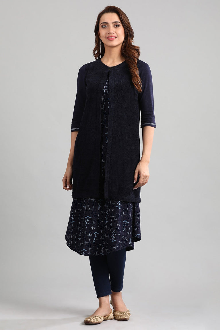 Turn Your Casual Look Into A Stylish One With This Knitted Dark Navy kurta. It Has Band Collar With Button Placket And Features Thread Embroidery.