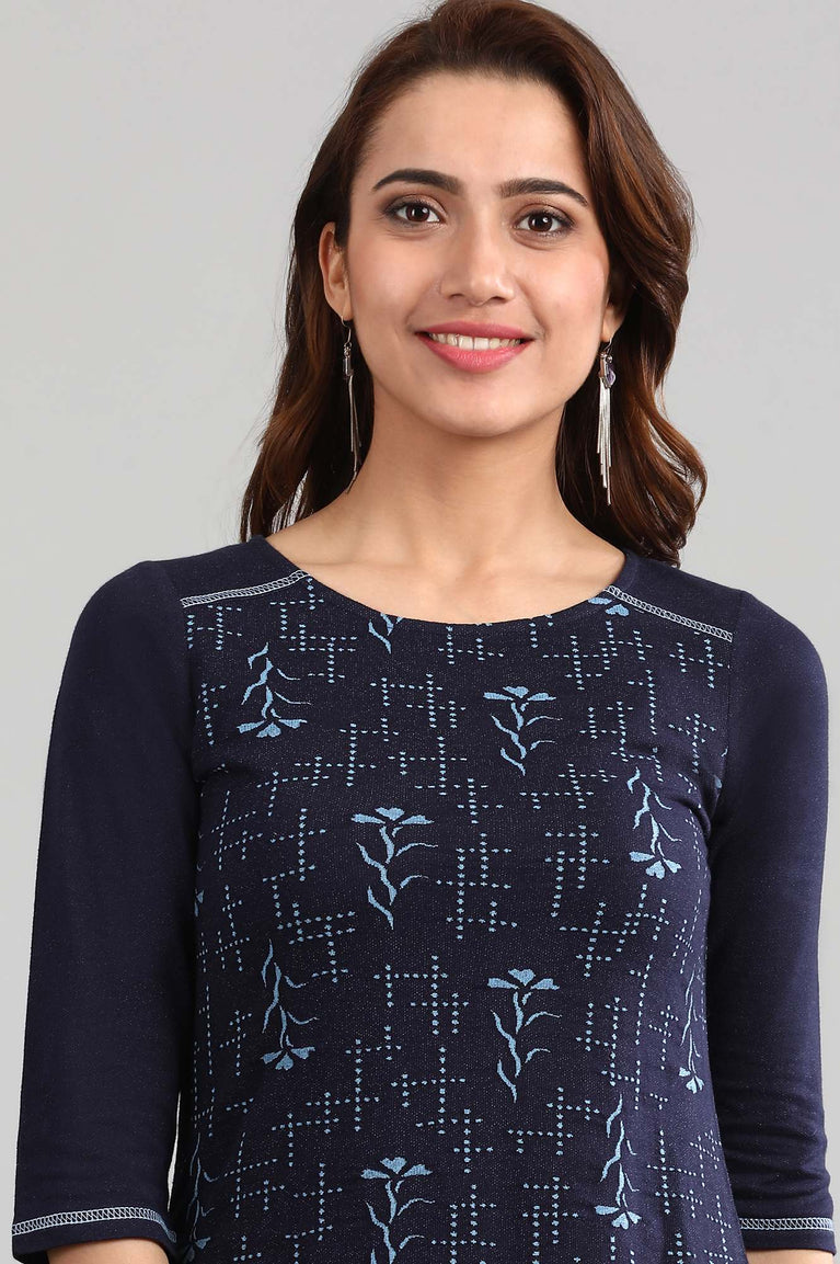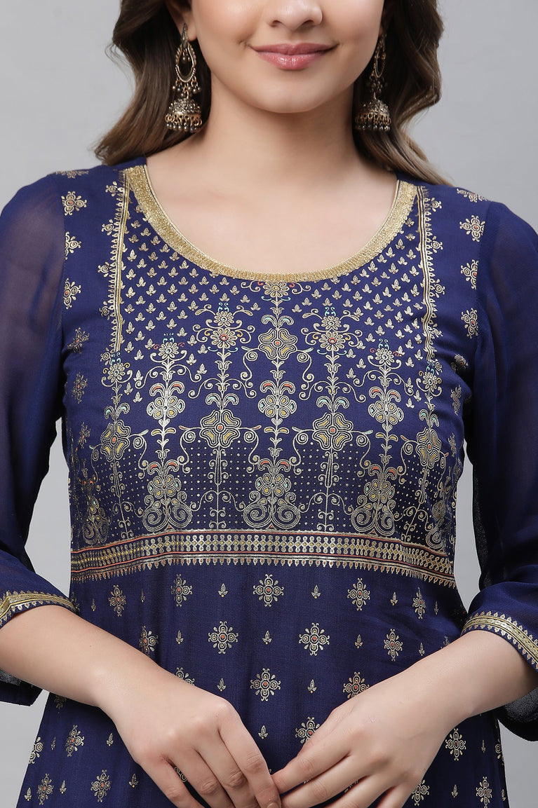 This Festive Season Revamp Your Wardrobe With This Aurelia'S Must-Have Kurta. Blue Foil Printed Kurta Having Sequin Work On Neck. It Features Round Neck And Three-Qaurter Sleeves.