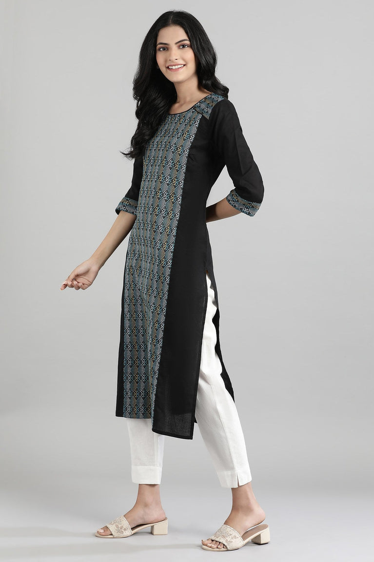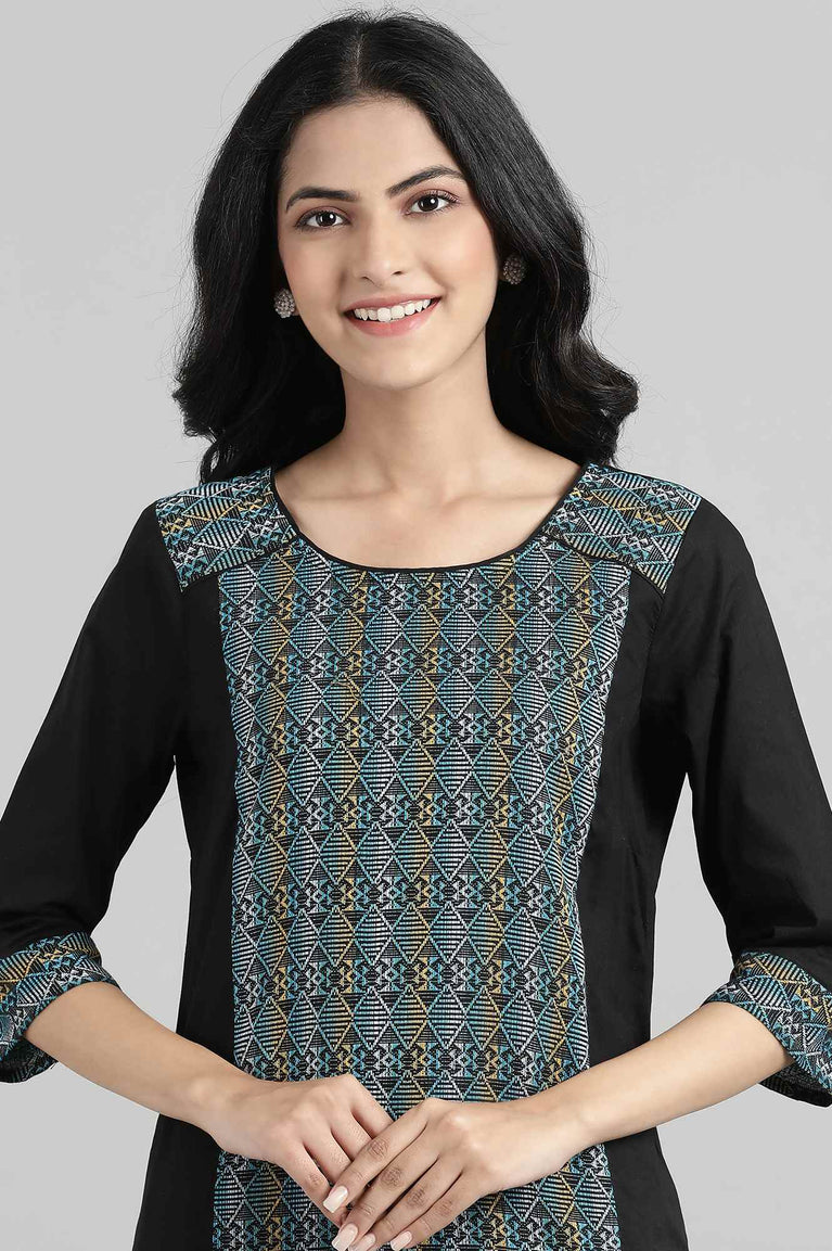 Black dobby kurta in round neck and 3/4th sleeves.