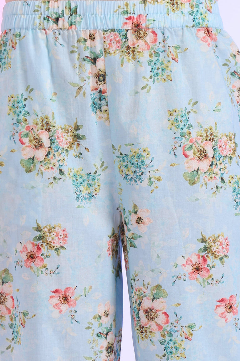 Blue Printed Straight Kurta with Palazzo & Dupatta Set