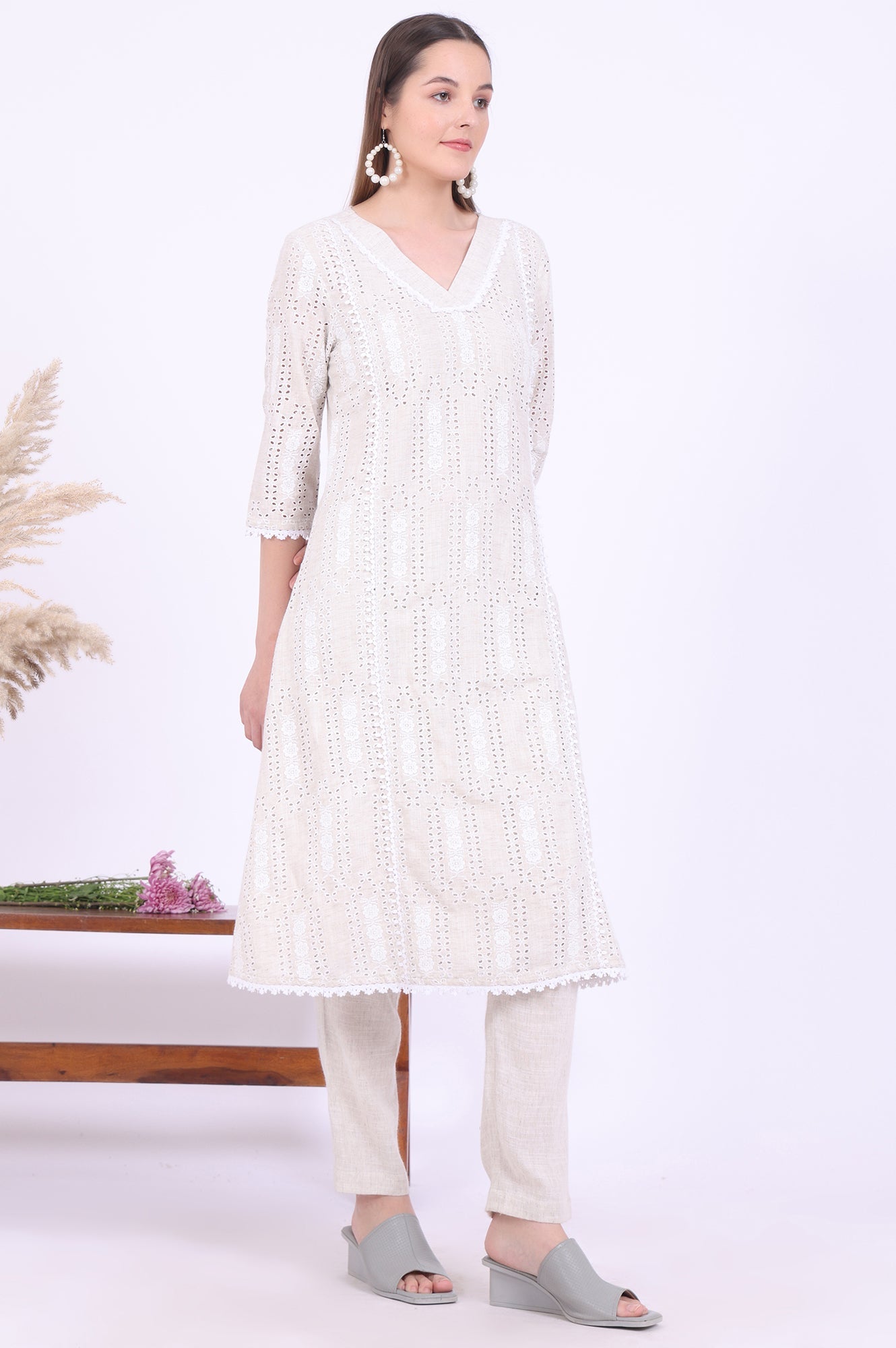 Discover the perfect blend of style and comfort with this fusion ethnic set from Aurelia. The v-neck kurta features exquisite schiffli detailing, adding a touch of elegance to your ensemble. Crafted from a luxurious blend of 90% viscose and 10% flax, this a-line kurta paired with trousers offers both comfort and breathability. The three-quarter sleeves provide versatility for various occasions, making it an ideal choice for special events. The khadi color exudes a timeless charm, while the machine-washable fabric ensures easy maintenance. This woven set combines traditional elements with contemporary design, making it a must-have addition to your wardrobe. Embrace the fusion of style and tradition with this stunning ethnic set from Aurelia.