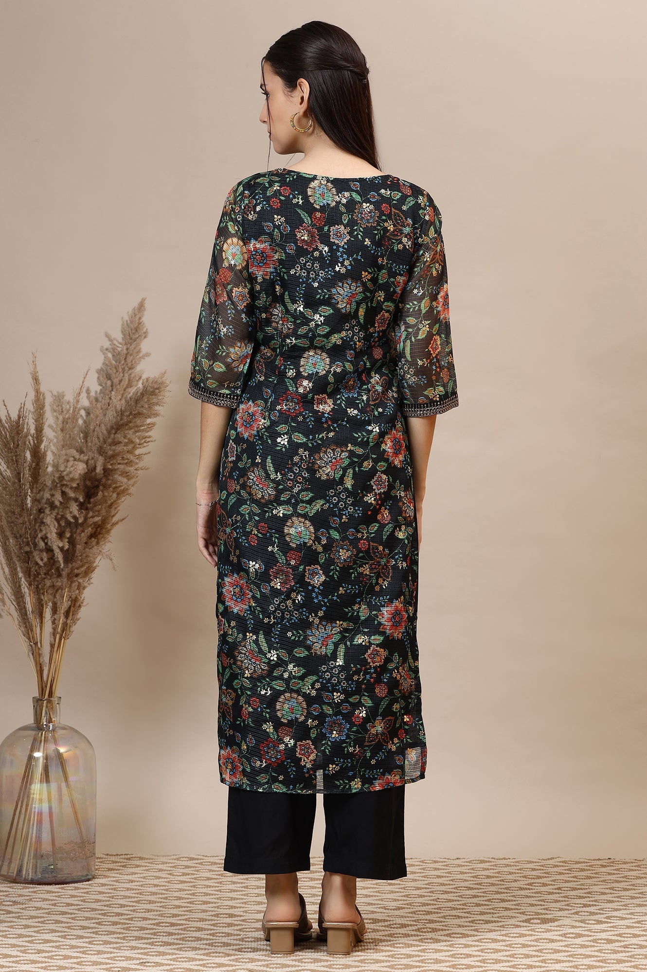 Black Floral Printed Straight Kota Kurta with Embroidered Neckline