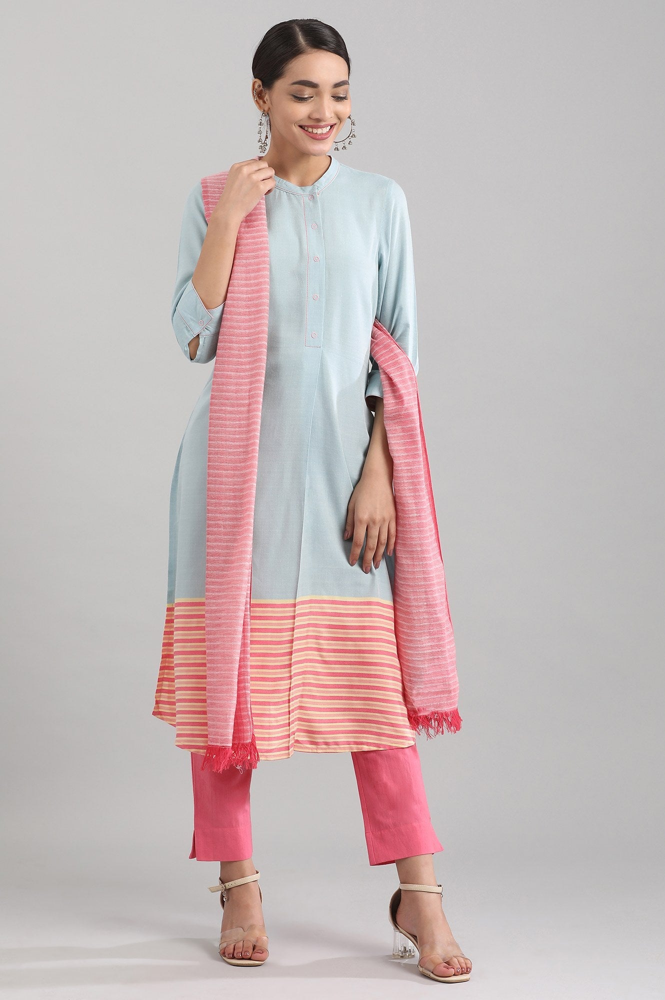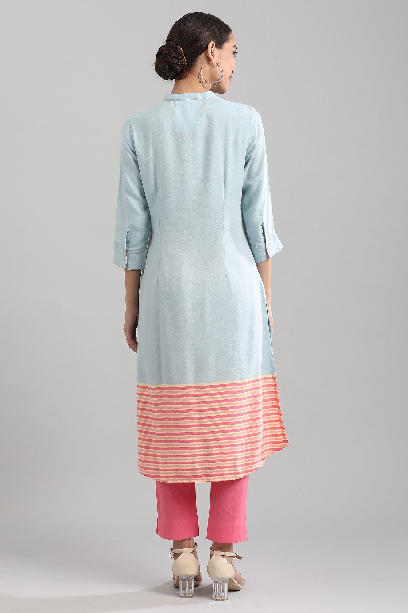 Blue band collar straight Liva kurta yarn-dyed Liva kurta with placket detail, cuff sleeves and button.