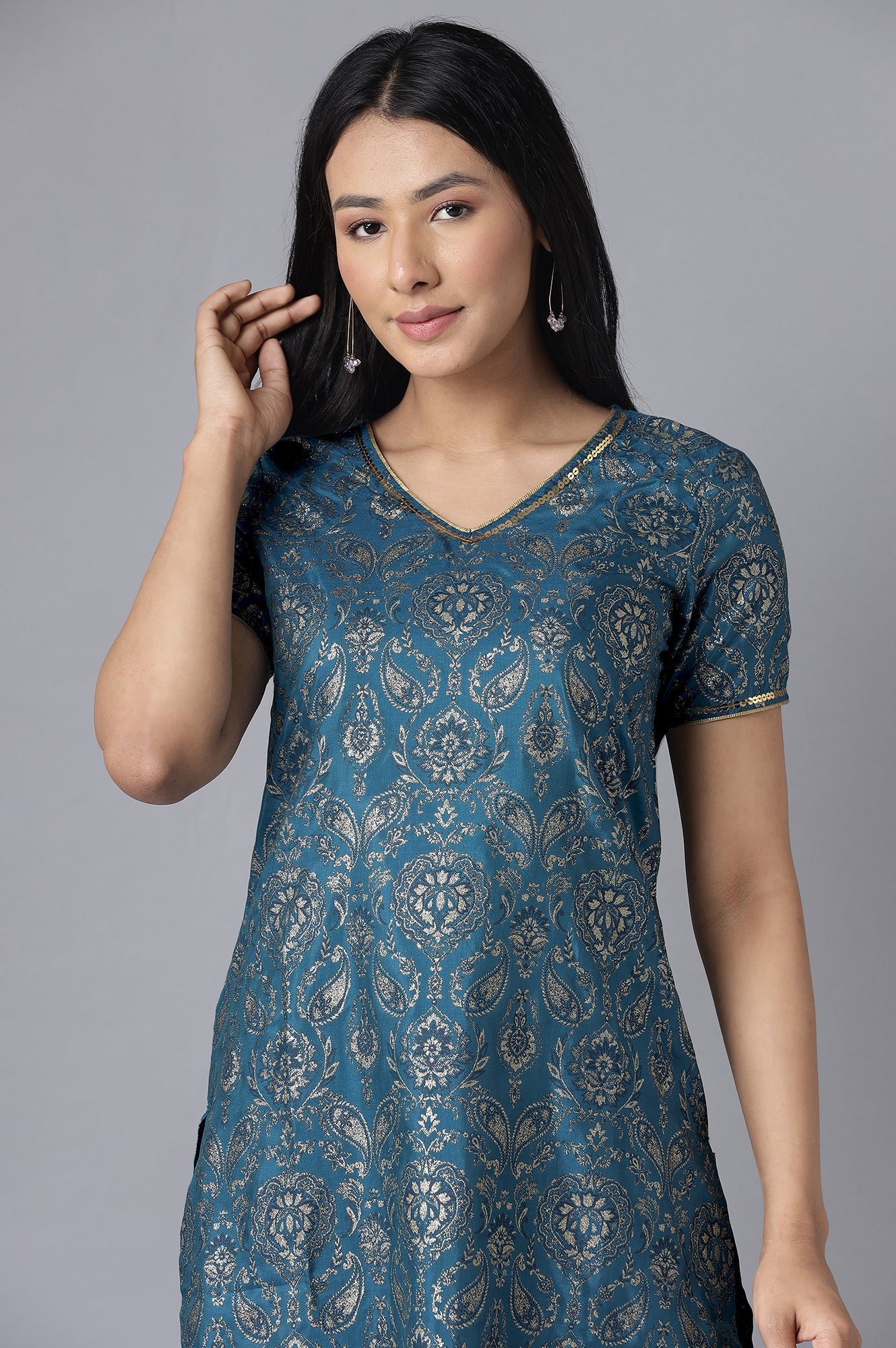 Twilight blue kurta having glittered floral print and sequin detailing. This straight silhouette kurta also features V-neck and short sleeves. It comes with solid blue palazzo in mid-rise and elasticated waistband.