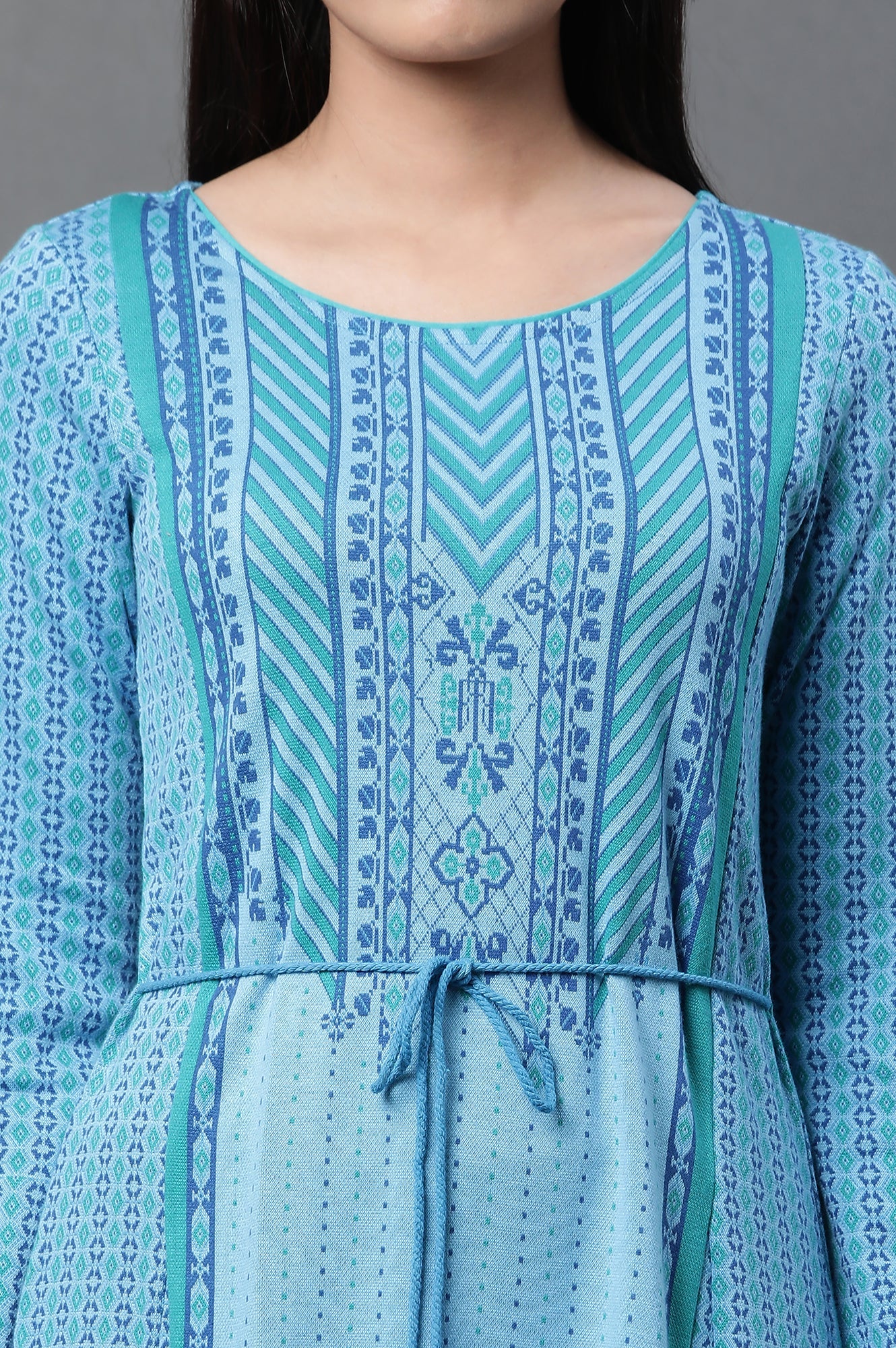 This effortlessly stylish A-line kurta set with placement print and basic round neckline detail is a versatile and trendy choice for your casual winter daywear. The A-line silhouette flatters your figure and offers a comfortable fit, while the placement print adds a touch of vibrancy and personality to the ensemble. Crafted from cozy winter-friendly fabric, this kurta set keeps you warm and snug during colder days. The kurta comes with solid winter tights.
