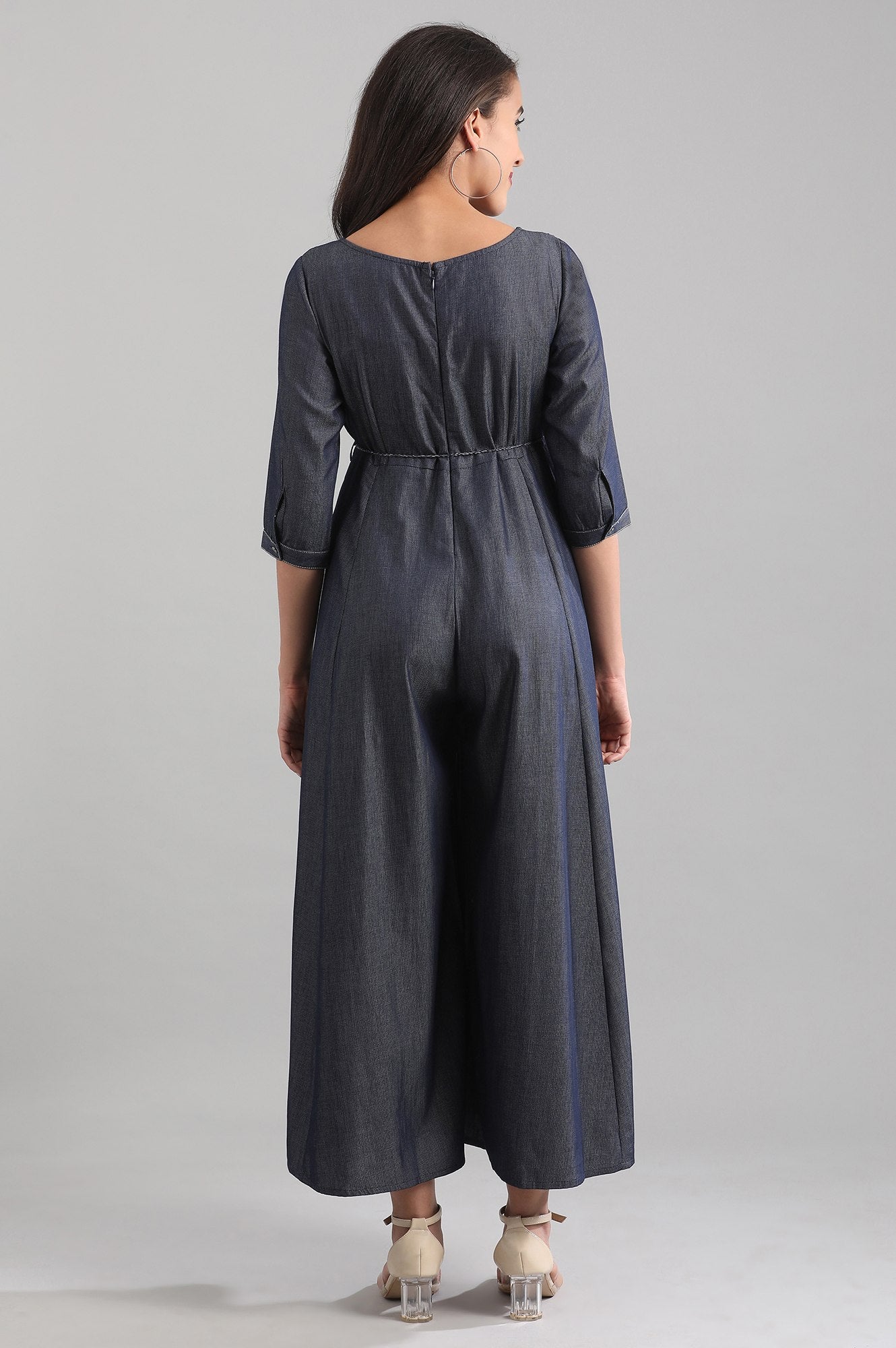 Blue round neck yarn-dyed jumpsuit with tie-up detail and pintuck detail on the yoke.