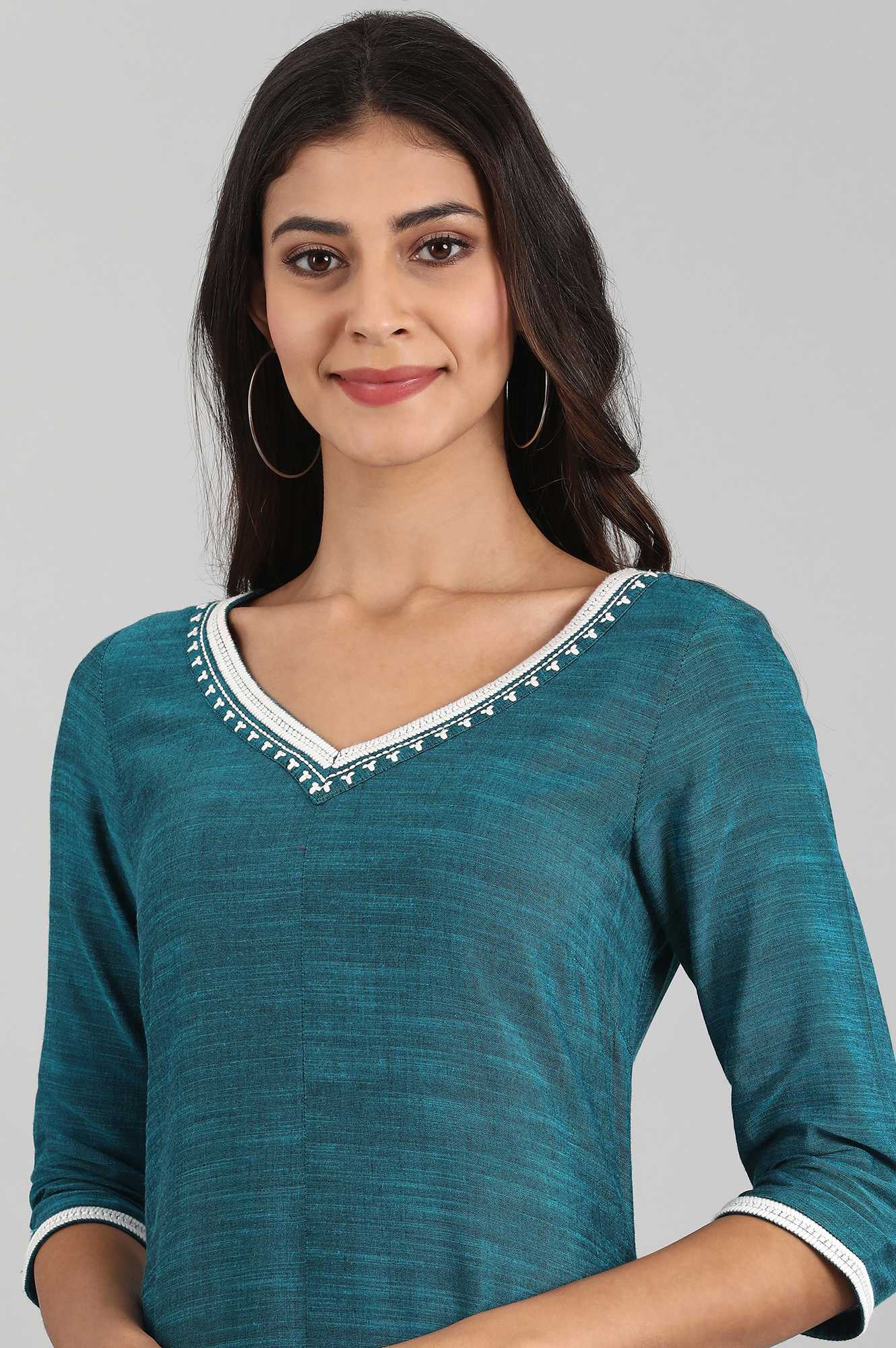 Blue A-line yarn-dyed Liva kurta with asymmetrical hemline and pocket detail.