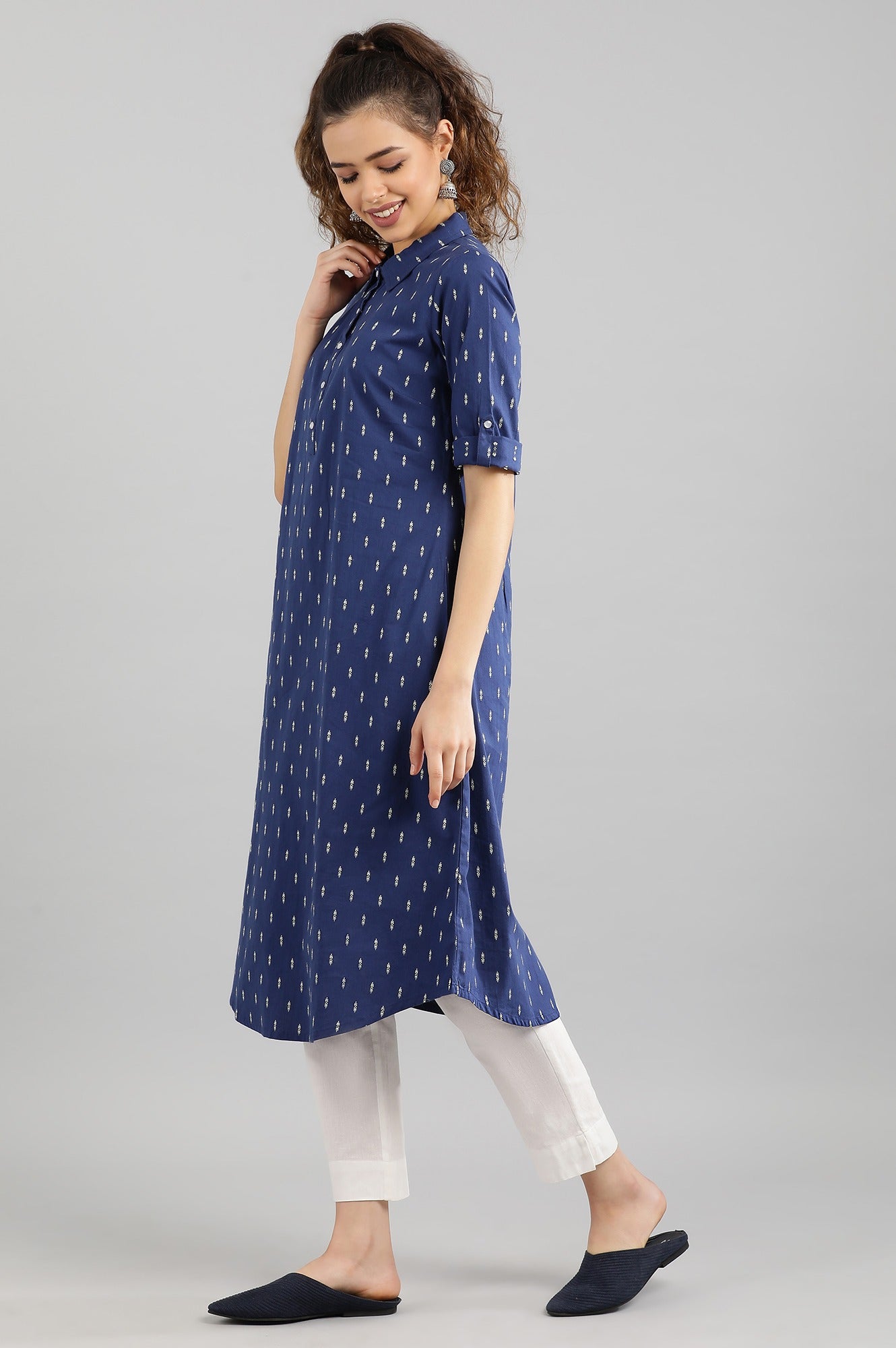 Navy blue Y/D A-line kurta in shirt collar with half placket and buttons. The kurta also features rolled-up sleeves.