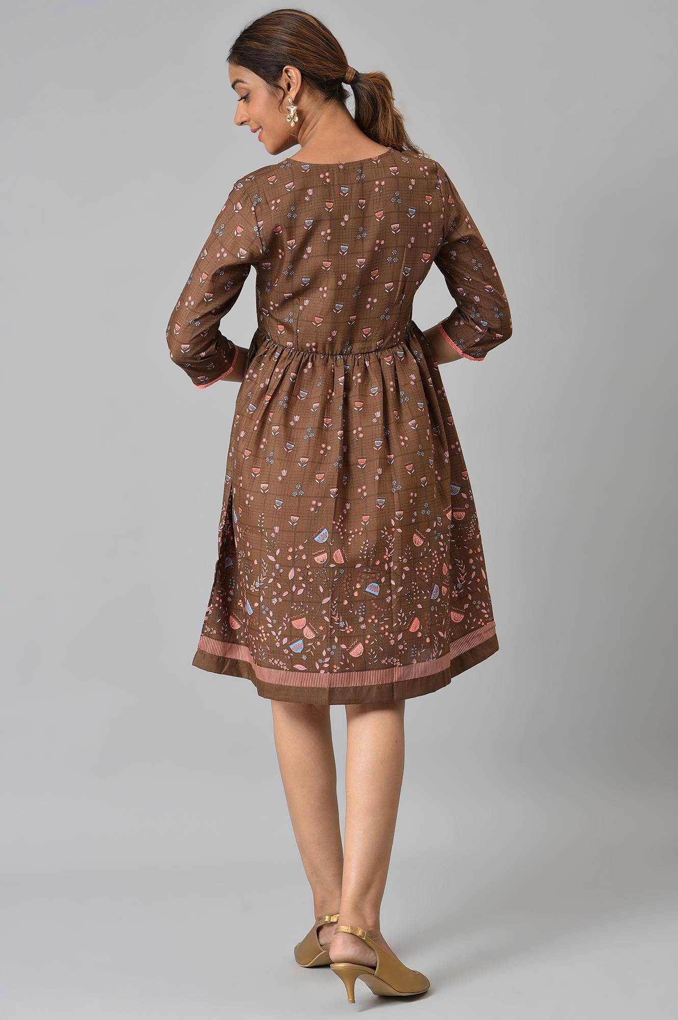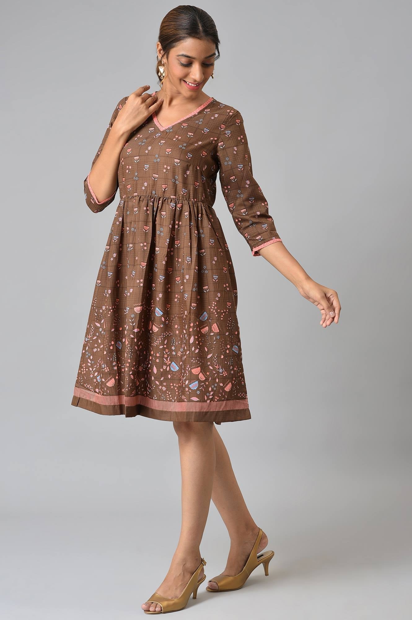 Be In Spot-Light With This Brown Floral Printed Flared Dress. The Dress Has V-Neck And Three-Quarter Sleeves.