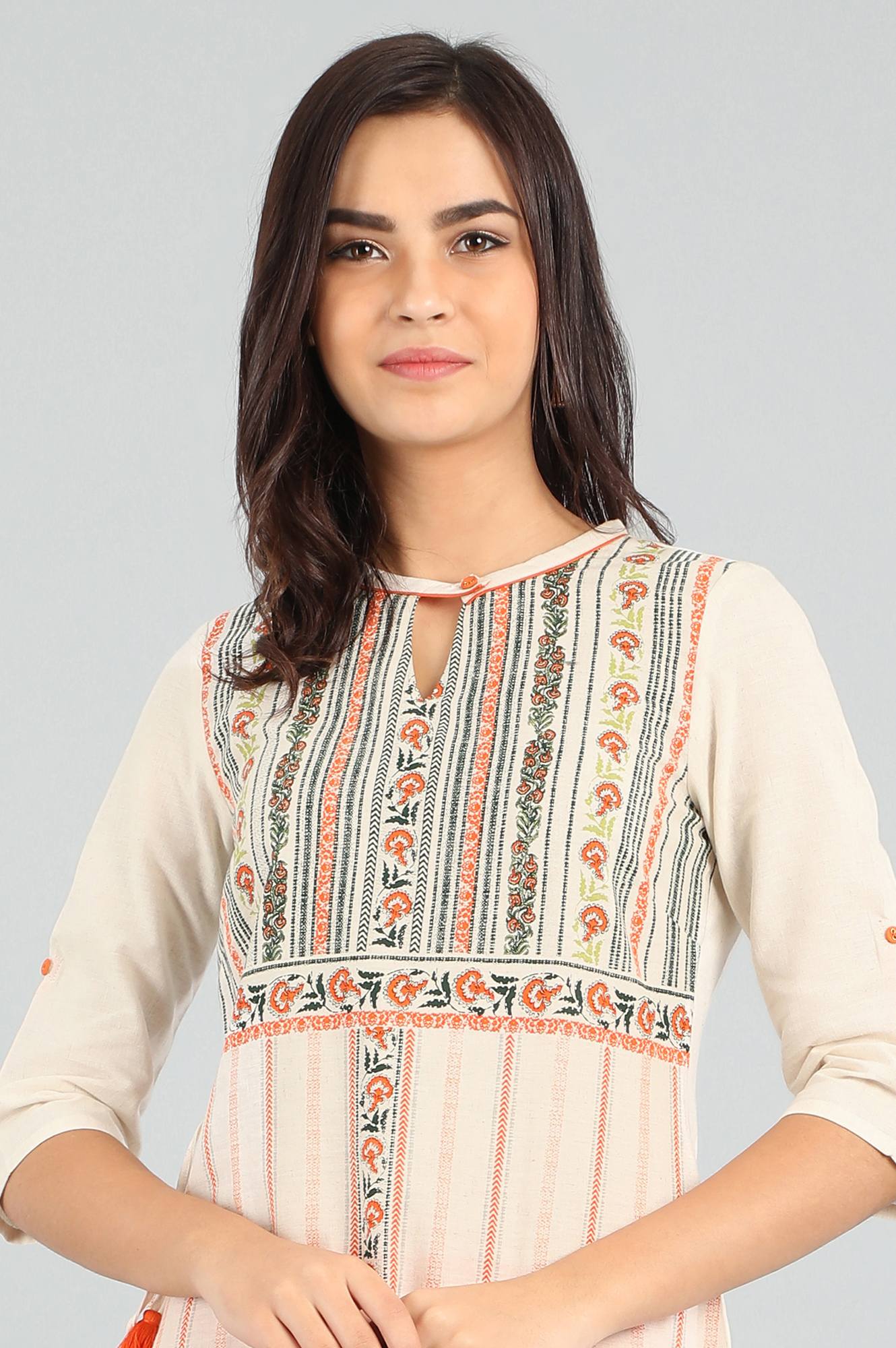 Ecru band collar 3/4 sleeve kurta with contrast printed detail, tie-up at one side and v-slit neckline. It is made up of cotton flax.