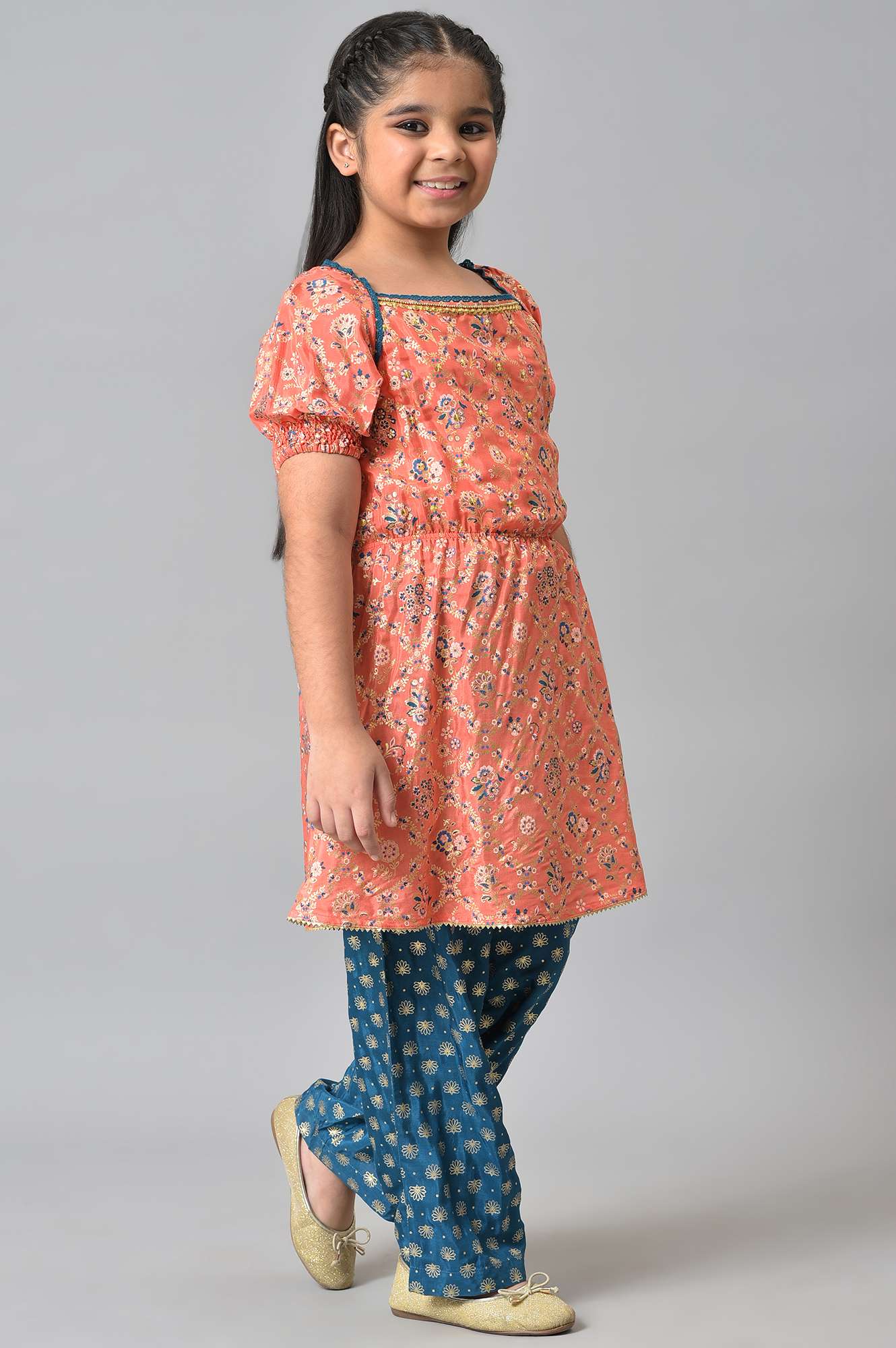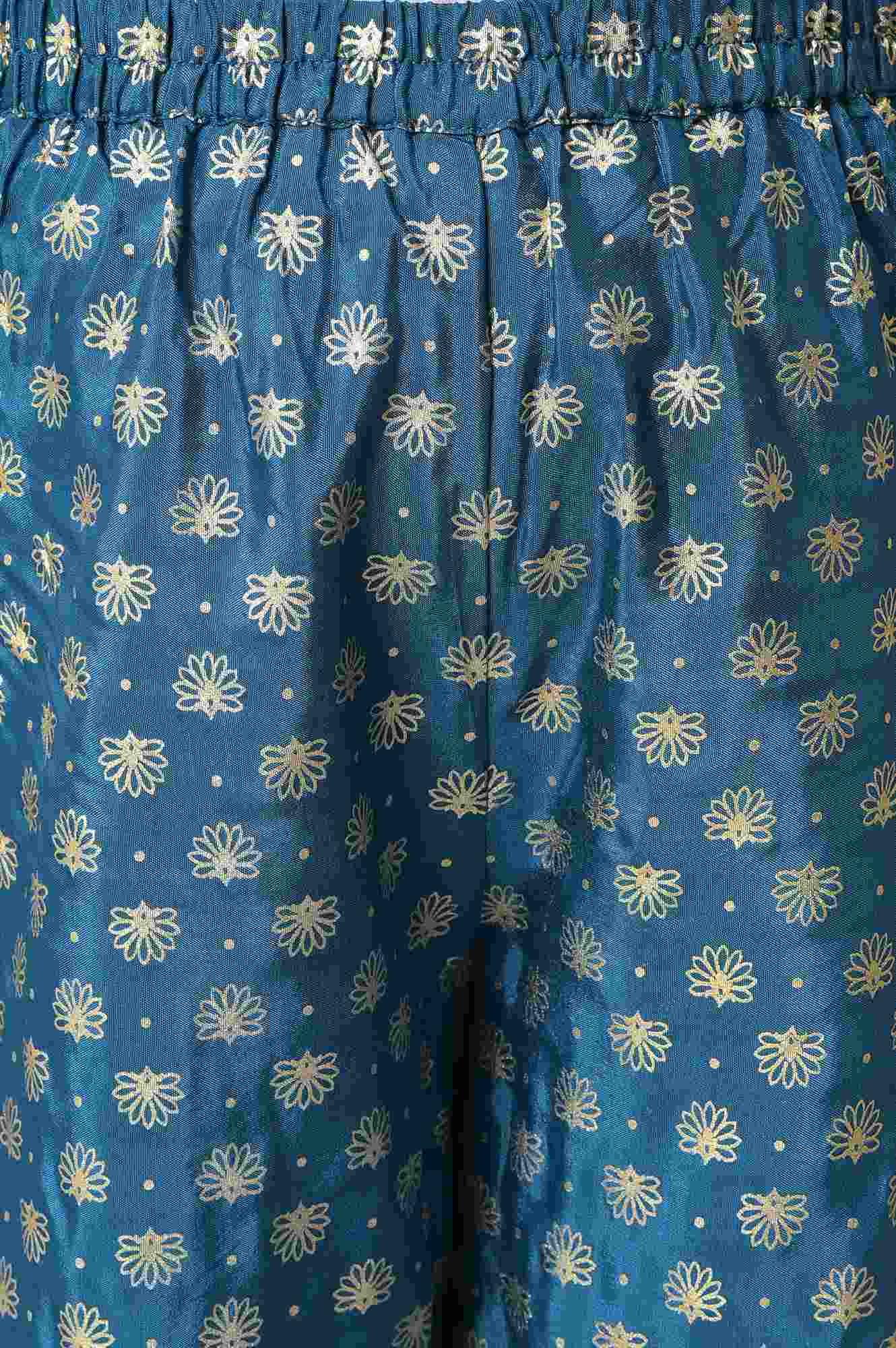 Girls LIVA Peach Floral Foil Print with Blue Straight Palazzo Set